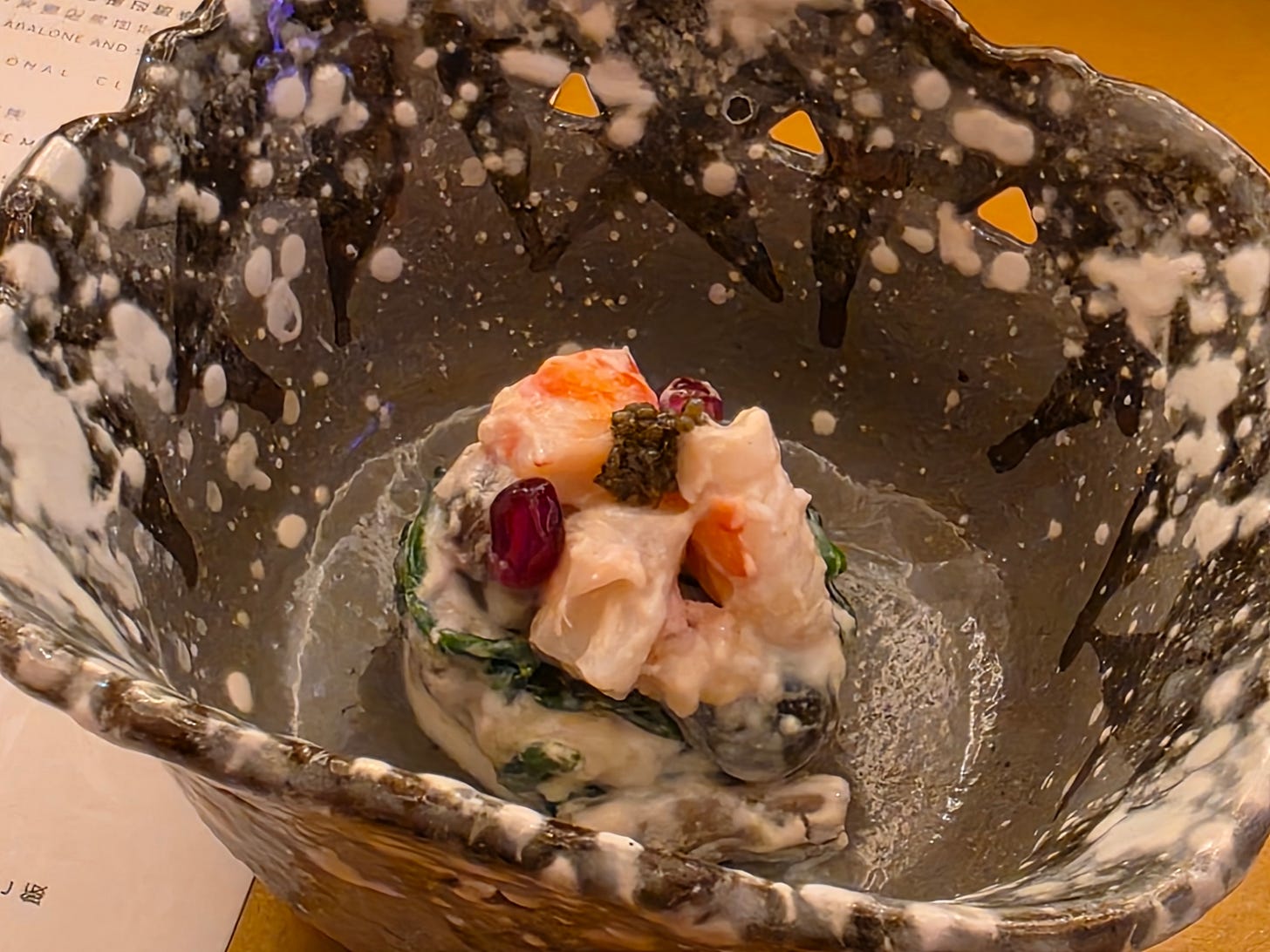 Shortly after, our first course arrived, a mixed salad of poached tiger prawns, spinach, pears, dressed in a mashed tofu, miso and sesame sauce and topped with a few pomegranates. Felt a bit like a Japanese version of a Waldorf salad that worked very well together.