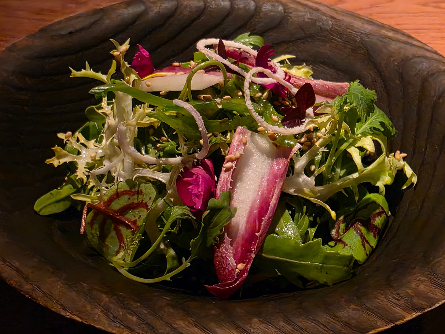 The next course was a signature, and at first I didn’t understand why. It seemed like a fairly ordinary garden salad. It turns out, the vegetables are grown in house in the ashes from the grill, and the leaves hide a chunky rosemary-smoked potato mash. Topped with a bit of crispy shallot, edamame beans and a well- balanced dressing, a big hit, and not exactly what I expected from a place that specializes in fire!