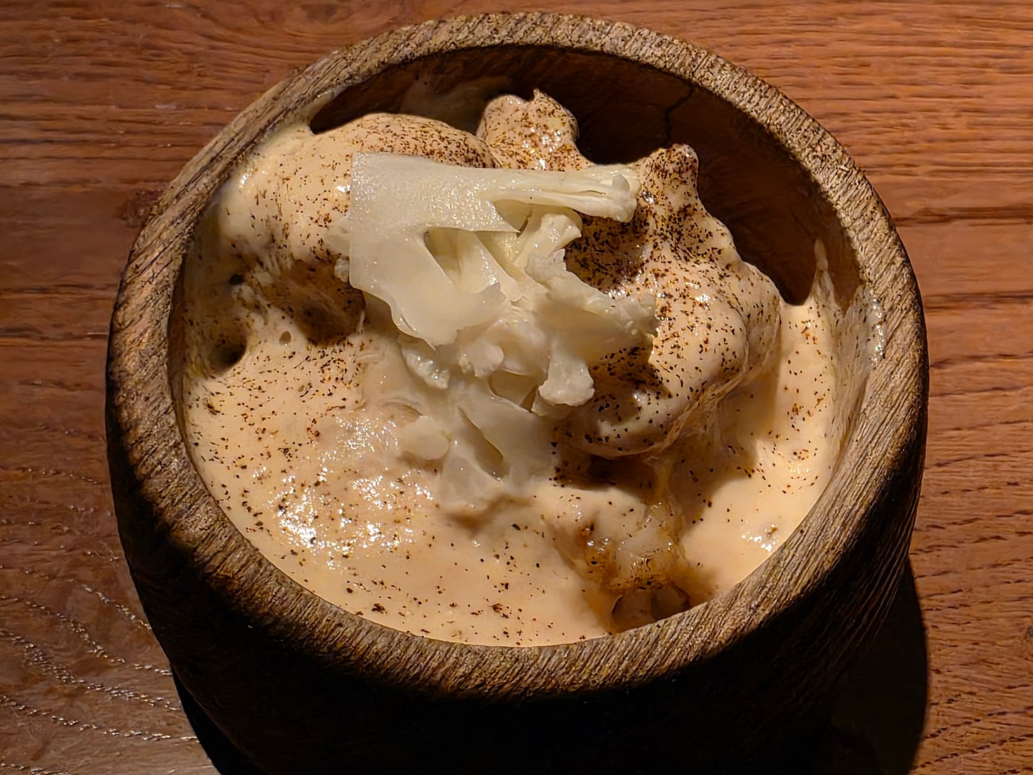 Moving on to the cauliflower, a vegetable that does very well with fire. Roasted over oak wood and coated with white miso, cheese and truffle dressing, a bit of acid from pickled cauliflower slices to cut into the fattiness of the sauce, all topped with a bit of grapefruit, whey and brown butter. A lot going on in the dish, and surprisingly worked really well together.