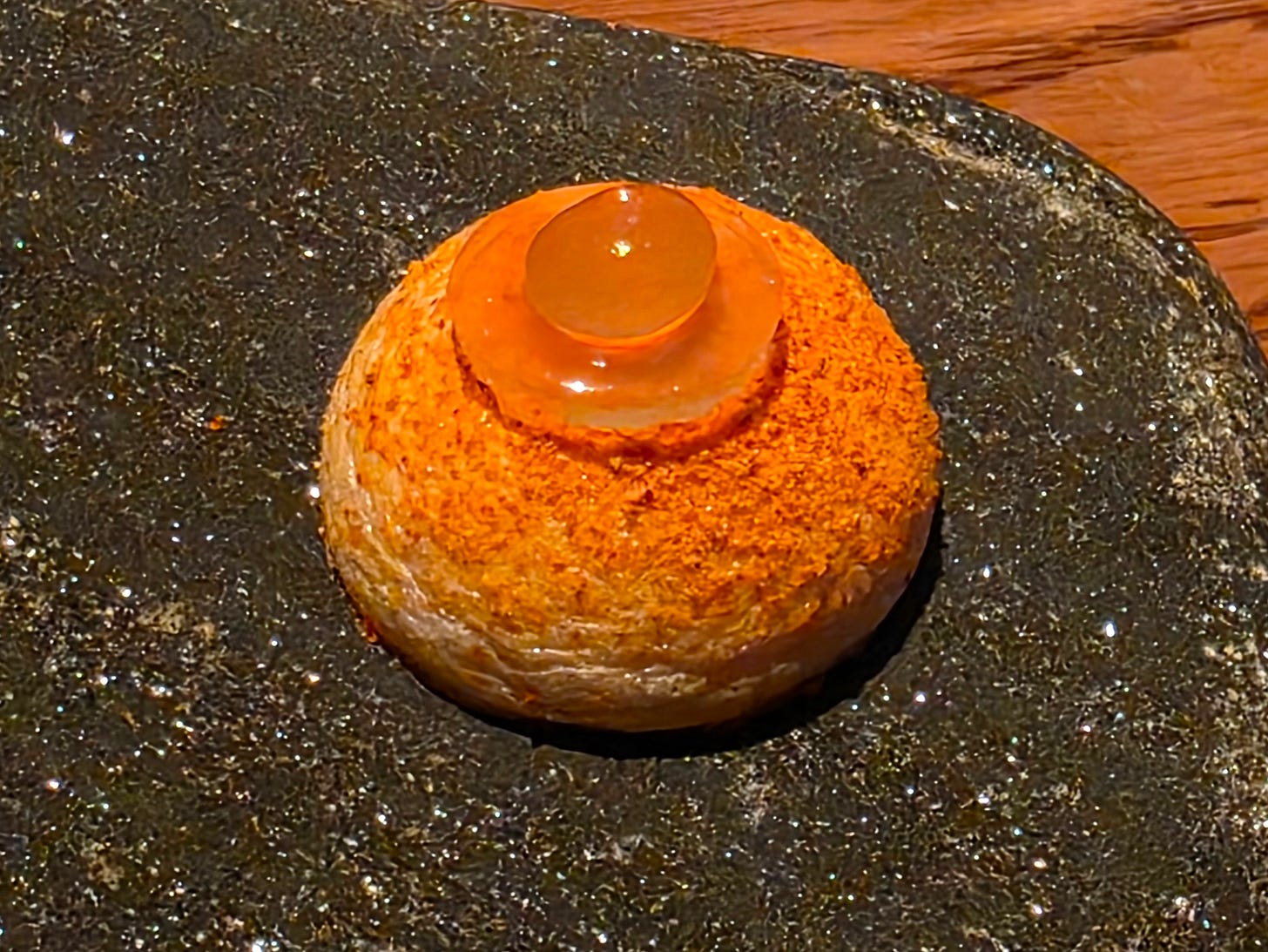 Firstly, a crispy meringue with a tomato jelly on top and dusted with a dehydrated tomato skin powder. Light and crispy meringue with a hit of tartness from concentrated tomato flavour.