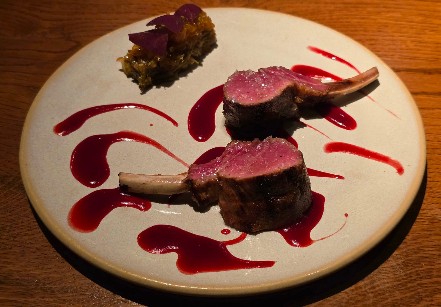 Two Cornish lamb chops appeared shortly after in a beetroot sauce, and served with an Italian bitter vegetable topped with an onion chutney. Great pairing, not intensely sweet. Well-executed.