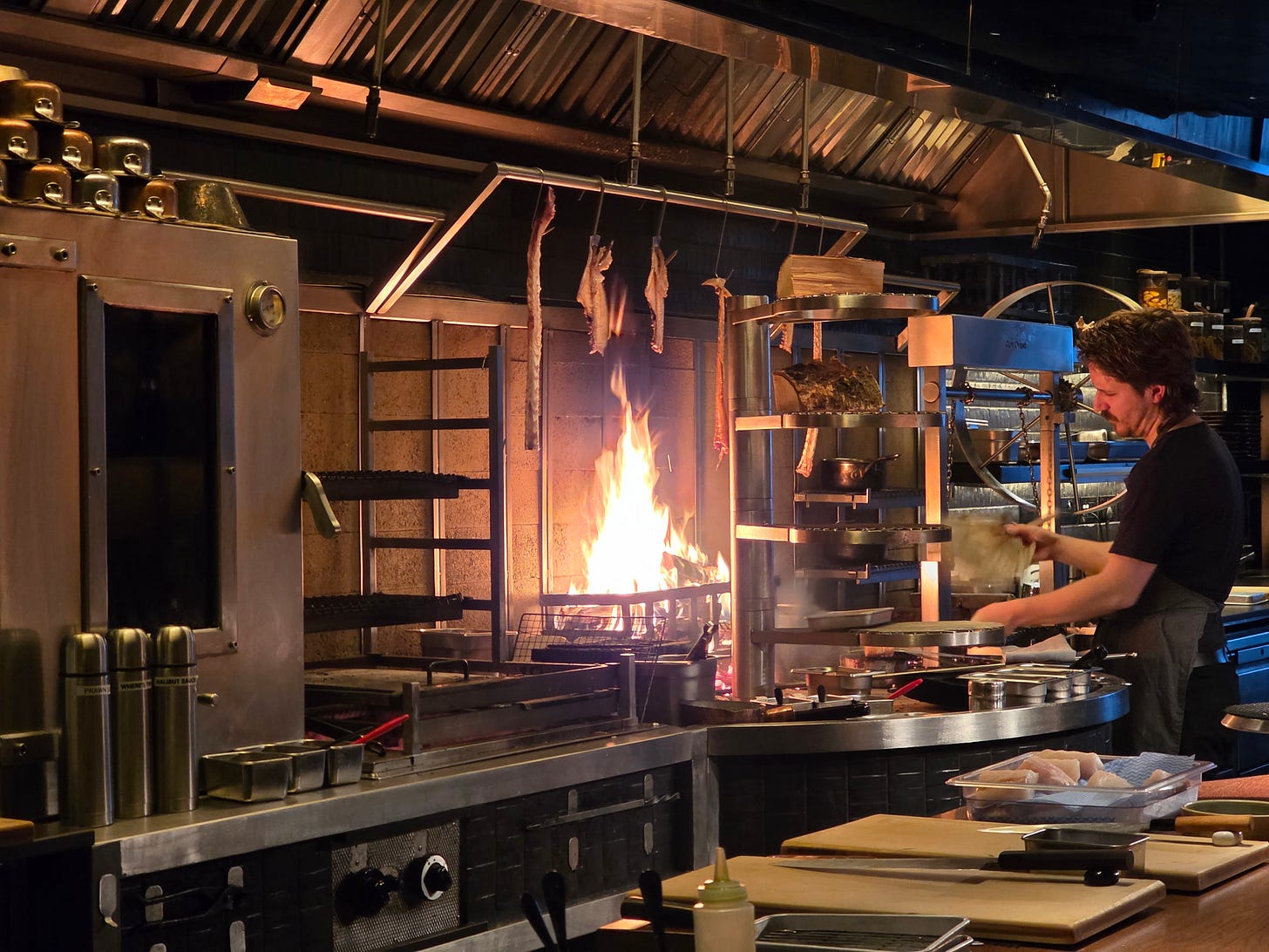 Walking off the street and into the restaurant was like stepping into a dark cave in the neolithic times - dark woods, dim mood lighting, all surrounding a long wood slab counter separating patrons from the show kitchen with the focal point being the open fire grill, with many different options for direct and indirect grilling. The blast of heat emanating from grill warming the entire room.