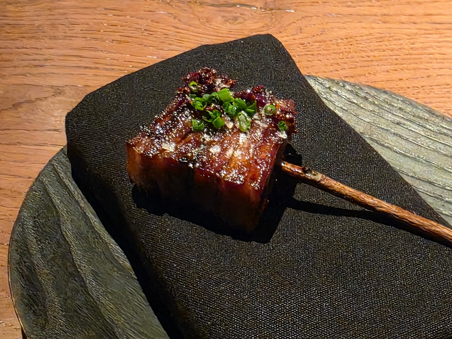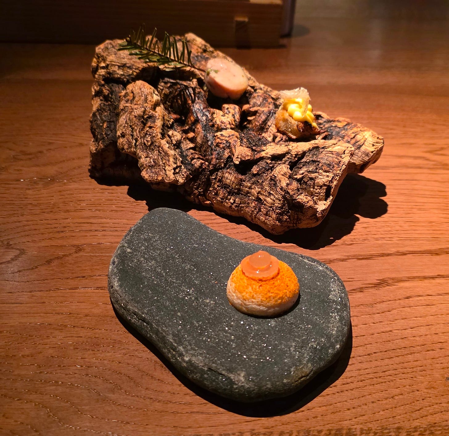 Finally, the 14 month aged tuna, served in a jerky form on top of a tuna vertebrae. Concentrated umami flavour, dense and chewy. Neat, but glad a single bite was about the right amount.