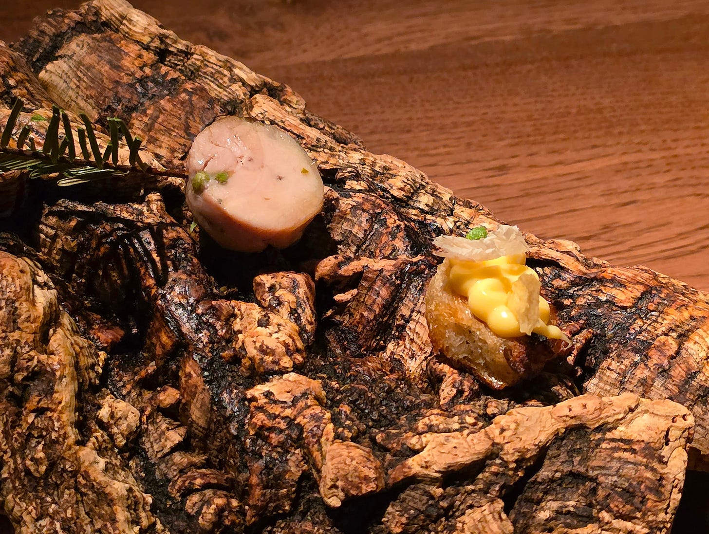 Next, a piece of sourdough with potato honey and a piece of fish bone that was slowly roasted over the fire until it was brittle and crispy. On its left was a medallion of chicken thigh, heavily smoked to the point it was almost bitter, skewered on a sprig of rosemary and topped with shiso pepper leaving a bit of kick on the palate.
