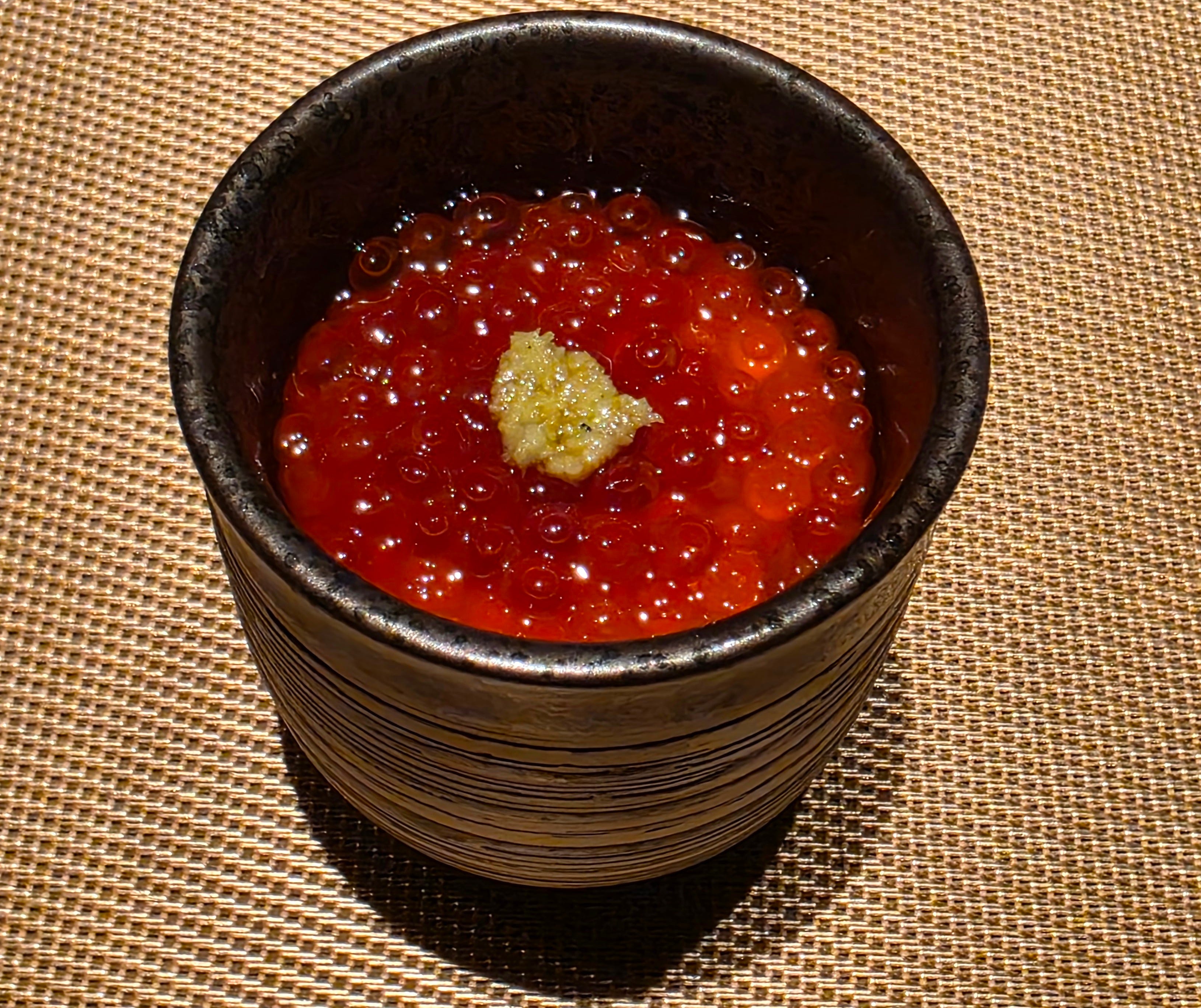 The meal opened with a chawanmushi topped with a generous portion of salmon roe and a dab of wasabi for a bit of kick. The raw ingredients were then laid out on the grill in front of us, as is tradition.
