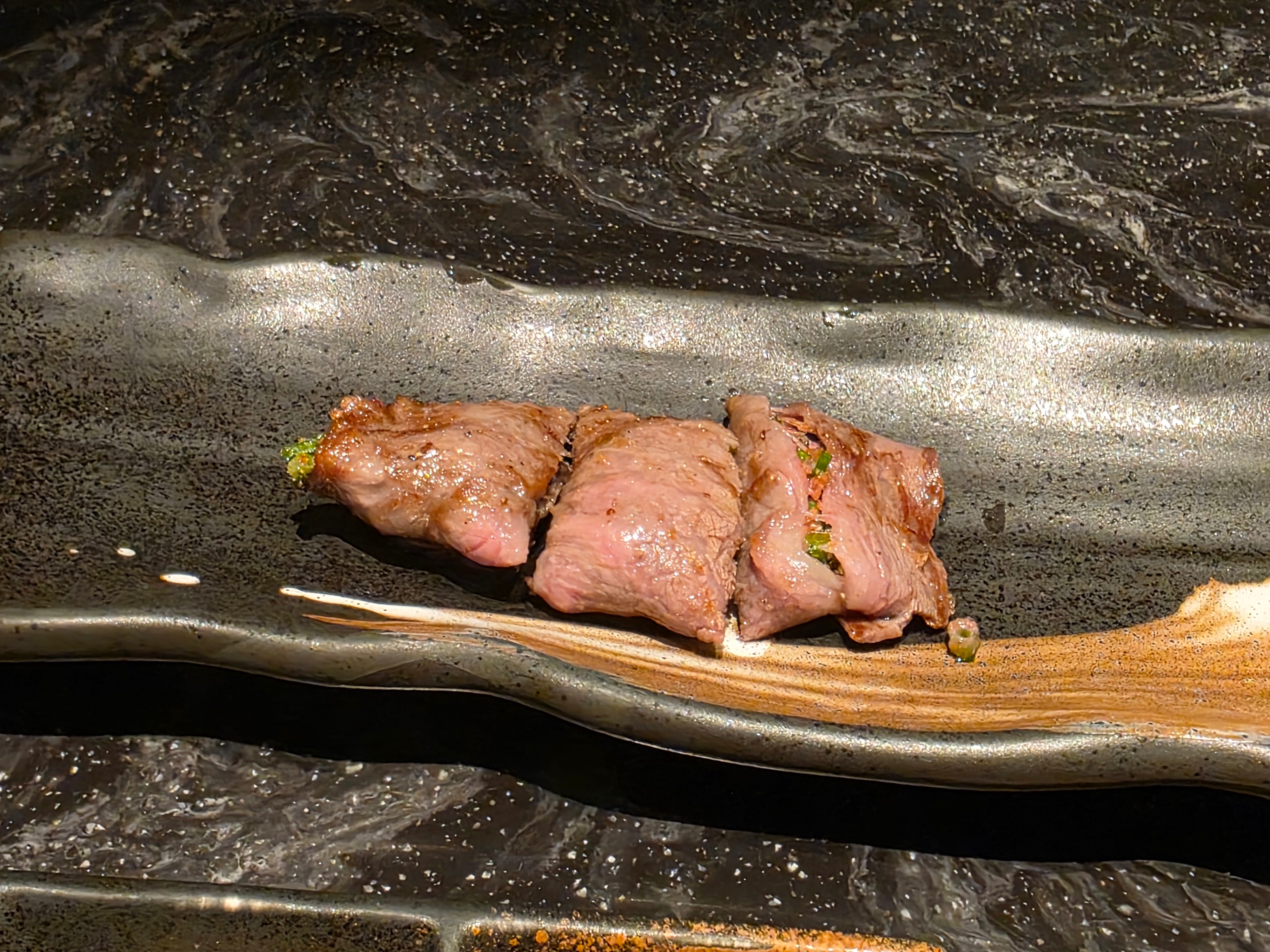 The A4 wagyu tenderloin came wrapped around deep-fried garlic flakes and green onion, rich without being heavy, with the garlic adding a sharp crunch against the soft beef.