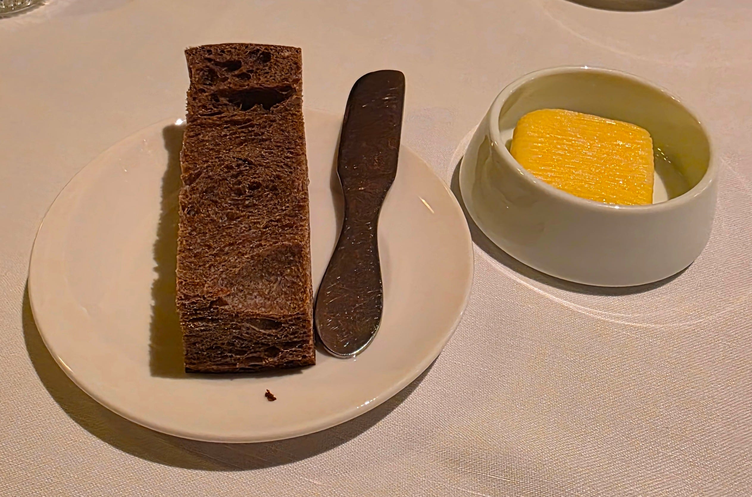 The bread came first. A dense rye sourdough with salted butter, unassuming but well made.