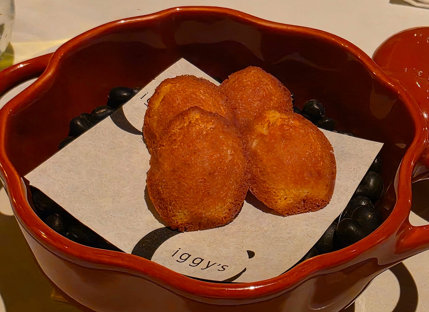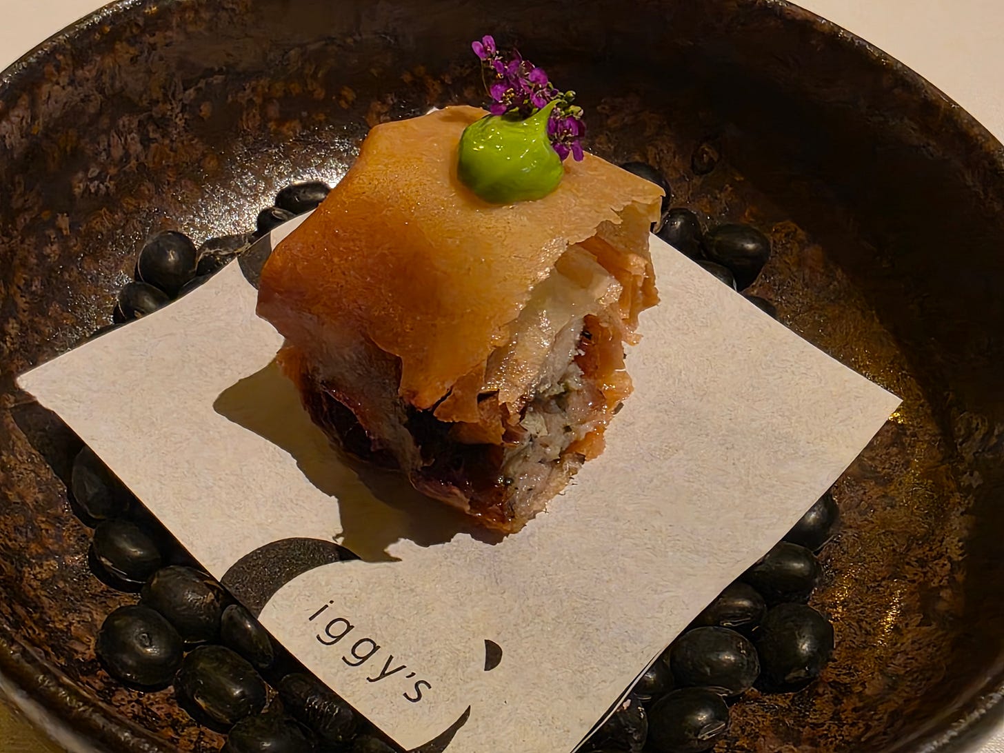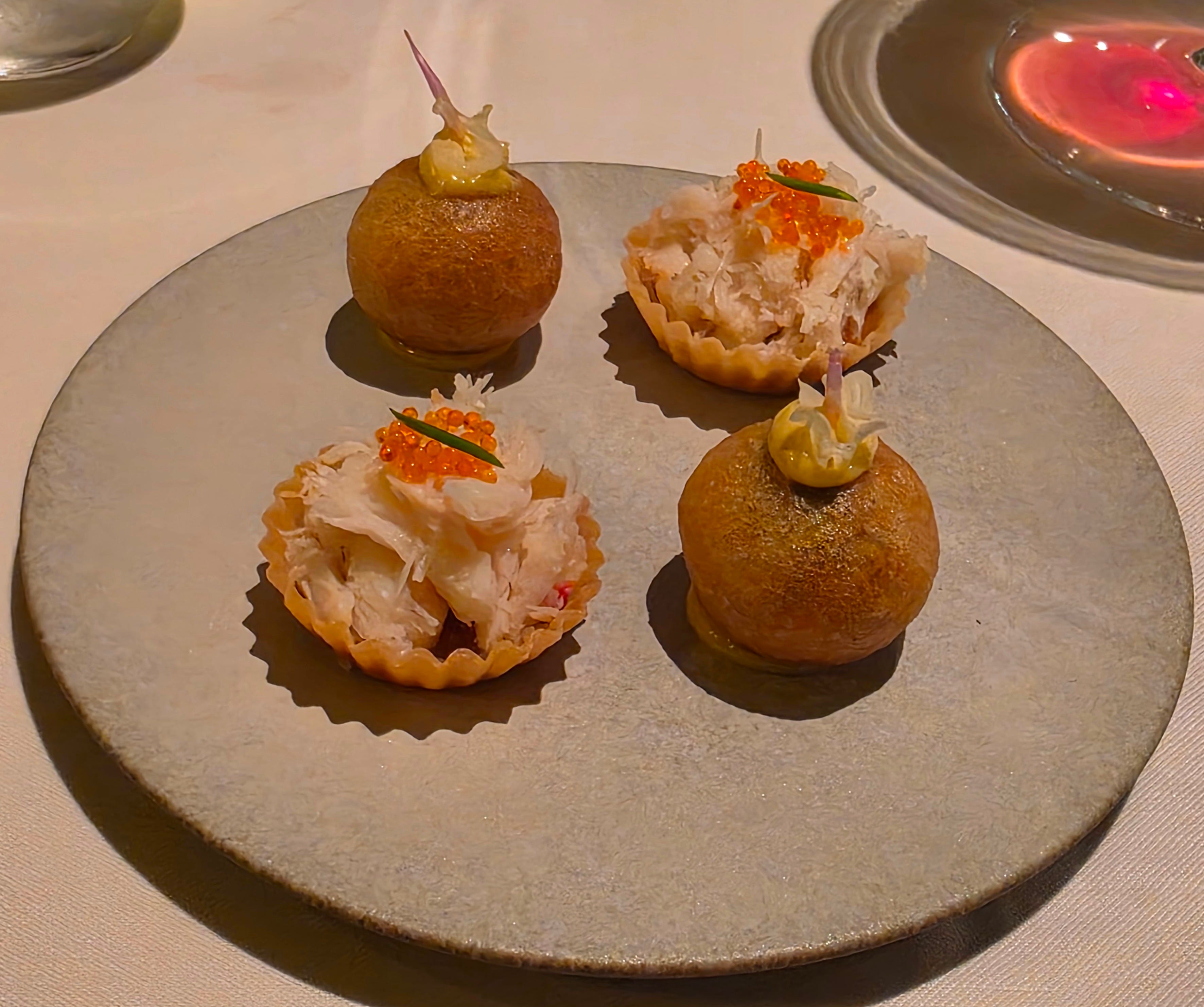 The canapés arrived in quick succession. First, Iggy's riff on chili crab, reimagined as a tart, much more restrained than Labyrinth's version. Alongside it, a fried filled doughnut.