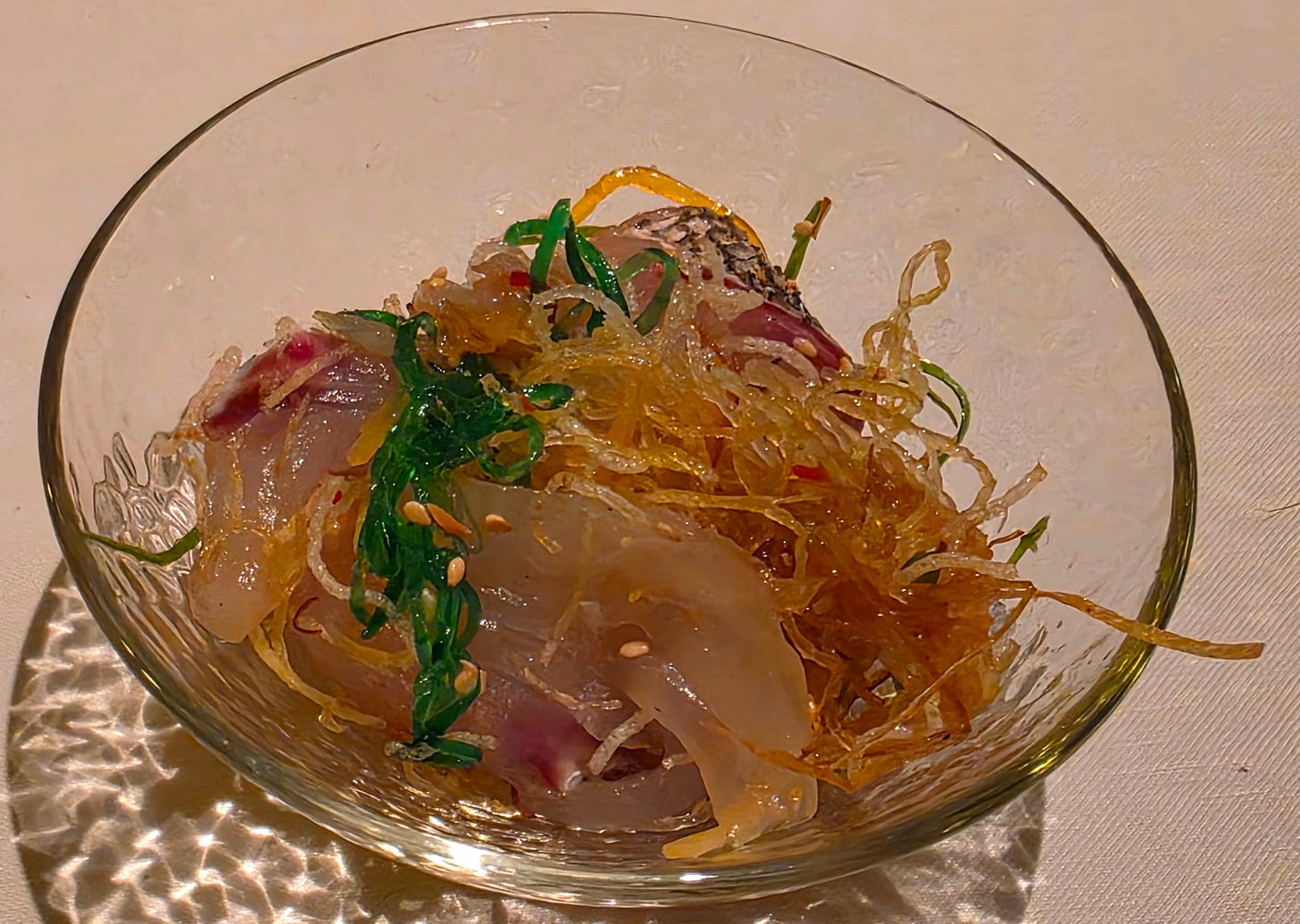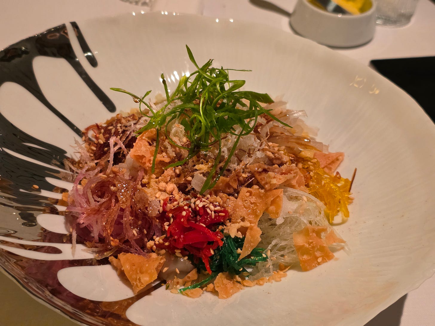 Then the yusheng, Iggy's take on lo hei: raw snapper with shredded vegetables (both raw and pickled), topped with crisp crackers, seaweed, crushed peanuts, and a sweet kombu soy sauce. Sweet, sour, salty, all colliding in one dish, exactly as the ritual demands.