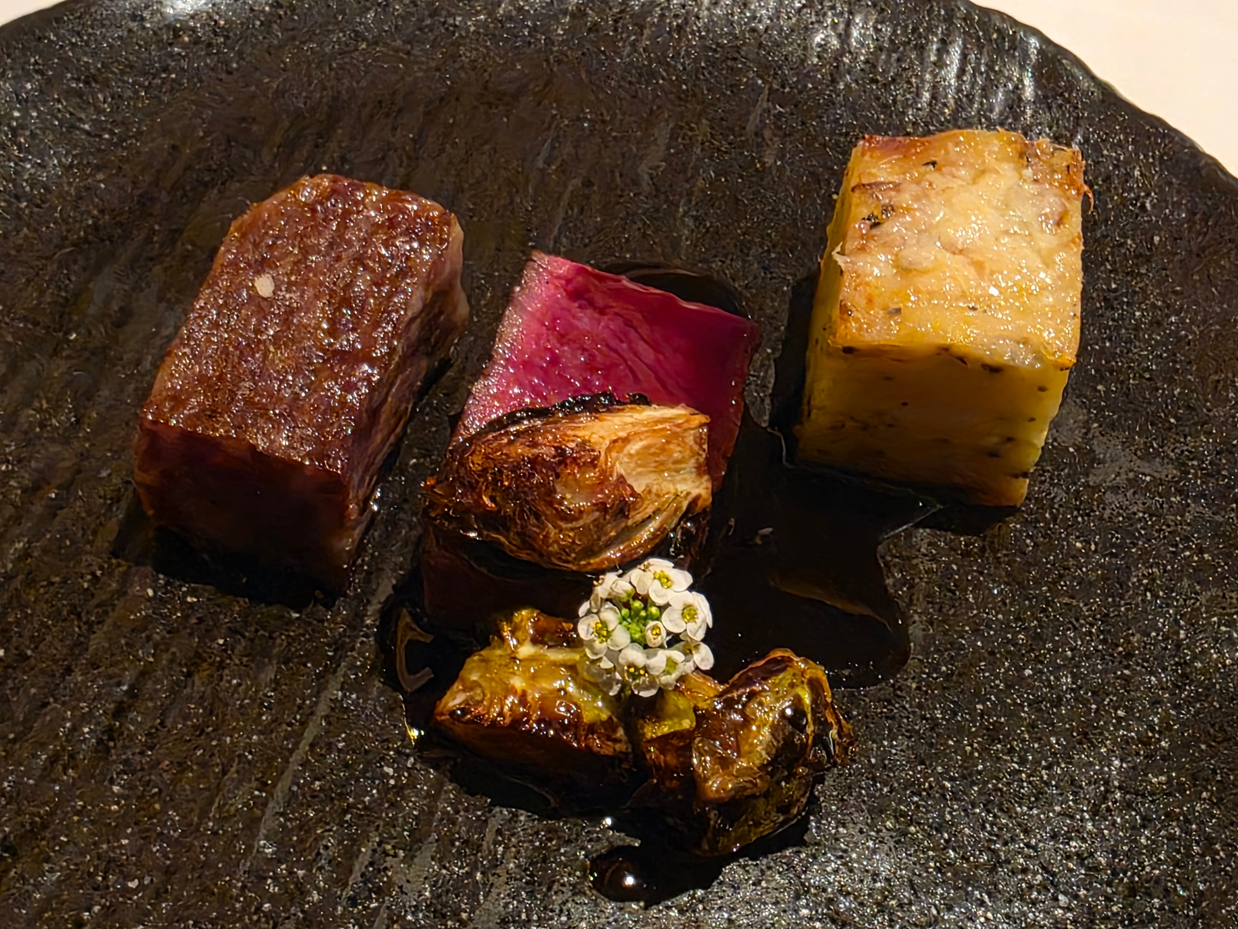 Given the choice between beef and duck, I went with the tried and true: a small piece of A5 wagyu striploin, an MB7 tenderloin, a cube of potato gratin, and a Brussels sprout. It looked modest on the plate but was extraordinarily rich, fatty, and filling.