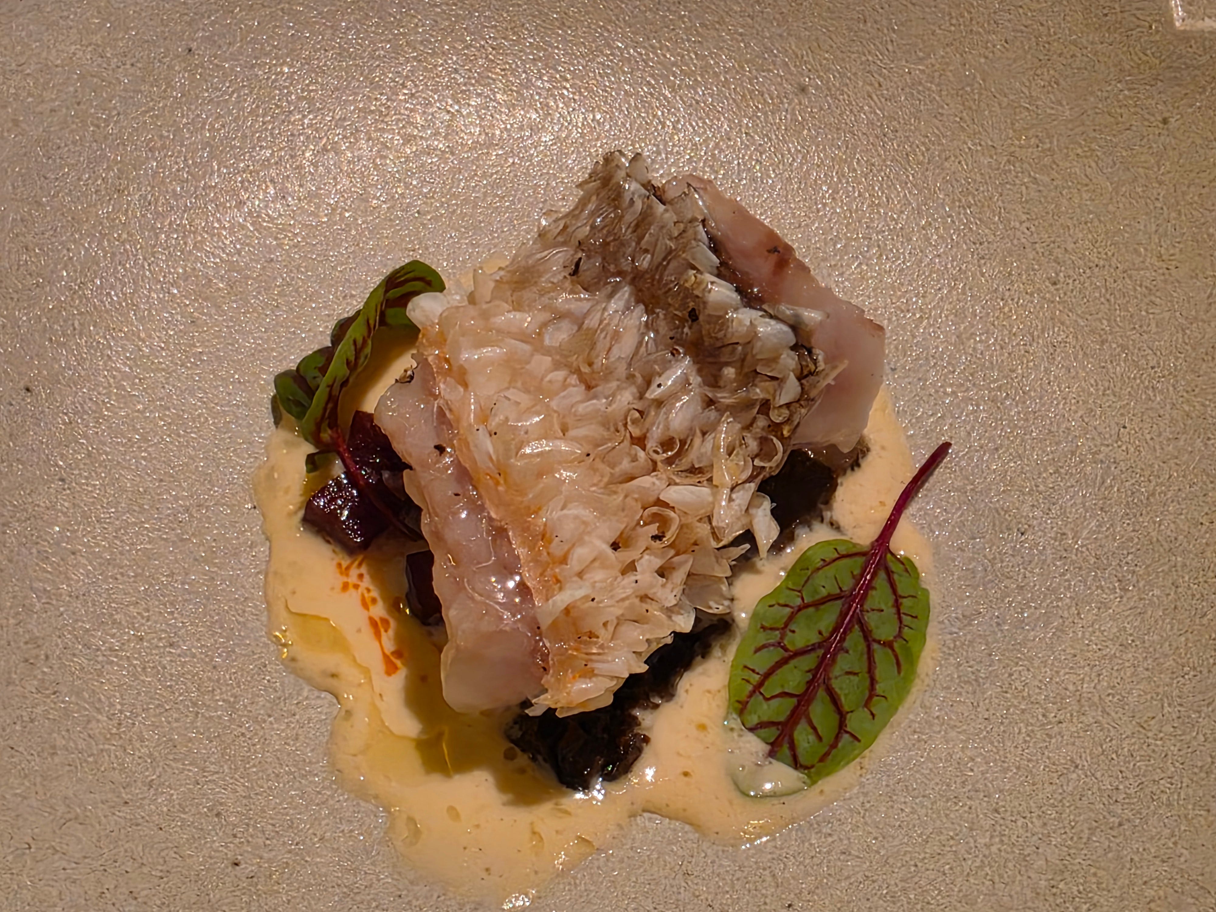 Whenever I see that particular skin texture on fish, I think tilefish, and tilefish it was. The fillet sat on a bed of Ibérico ham and morel mushrooms in a tangy vin jaune (the nutty, sherry-like wine from France's Jura region), finished with a sorrel leaf.