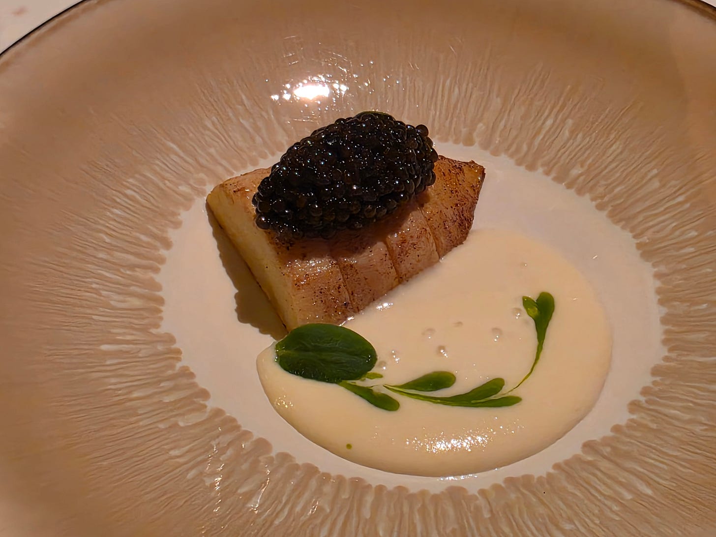 What I assumed would be a fish course turned out to be something else entirely: a shard of crisp bamboo shoot topped with a quenelle of caviar, served with a sweet corn velouté dotted with shiso oil.