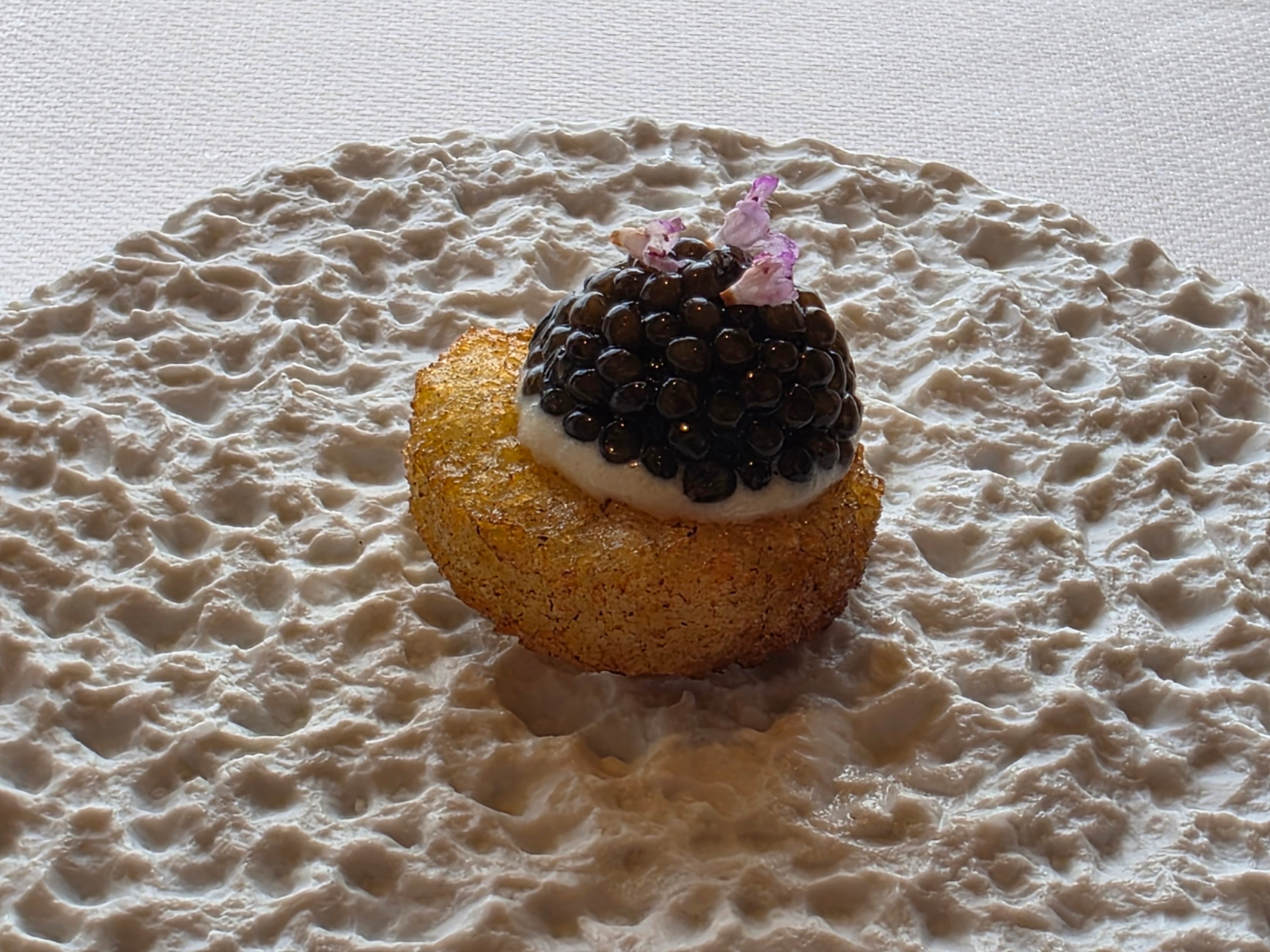 an off-menu amuse bouche - the fish and chips, a piece of doughy deep fried potato, with a dab of creme fraiche and caviar.