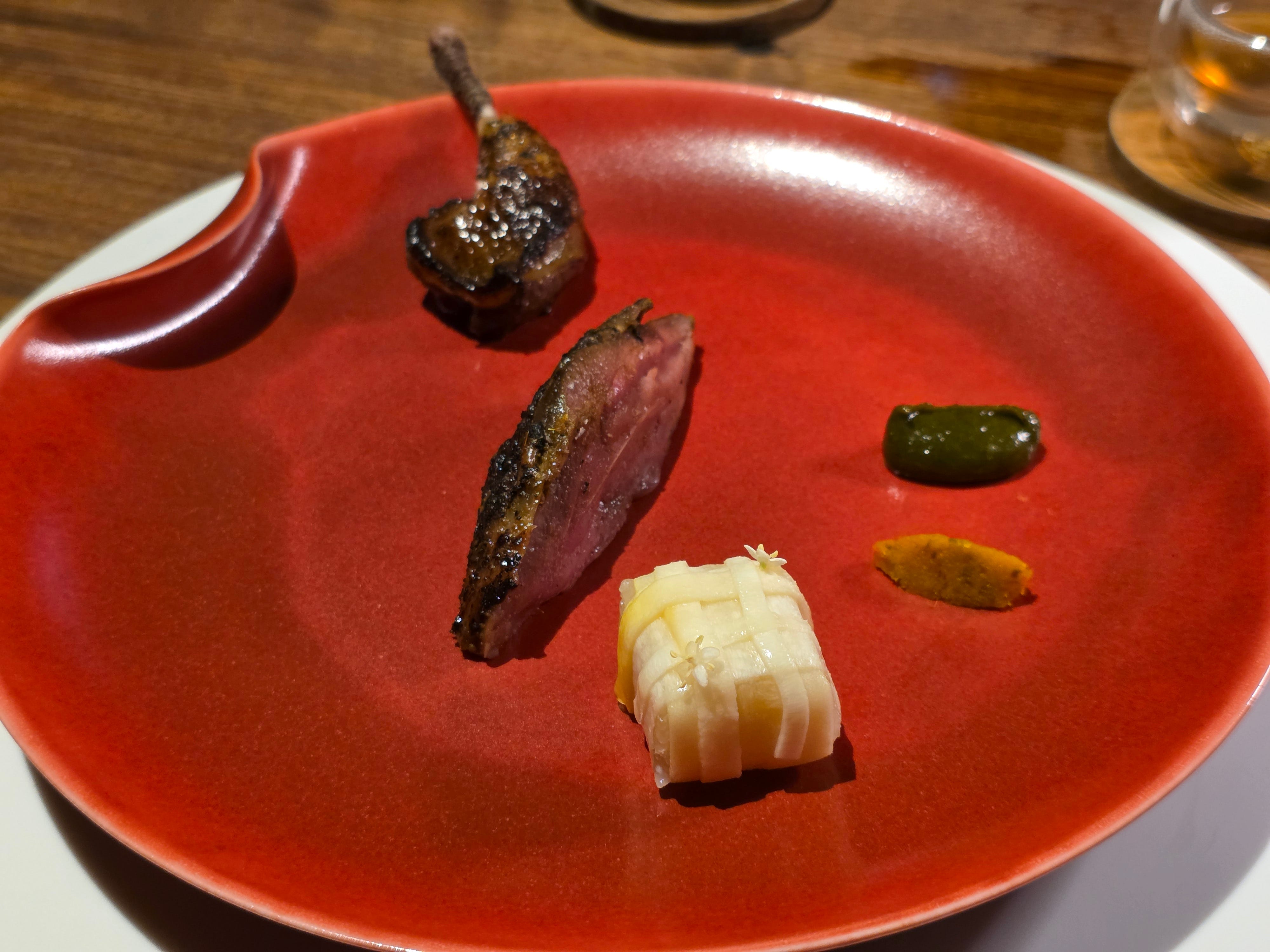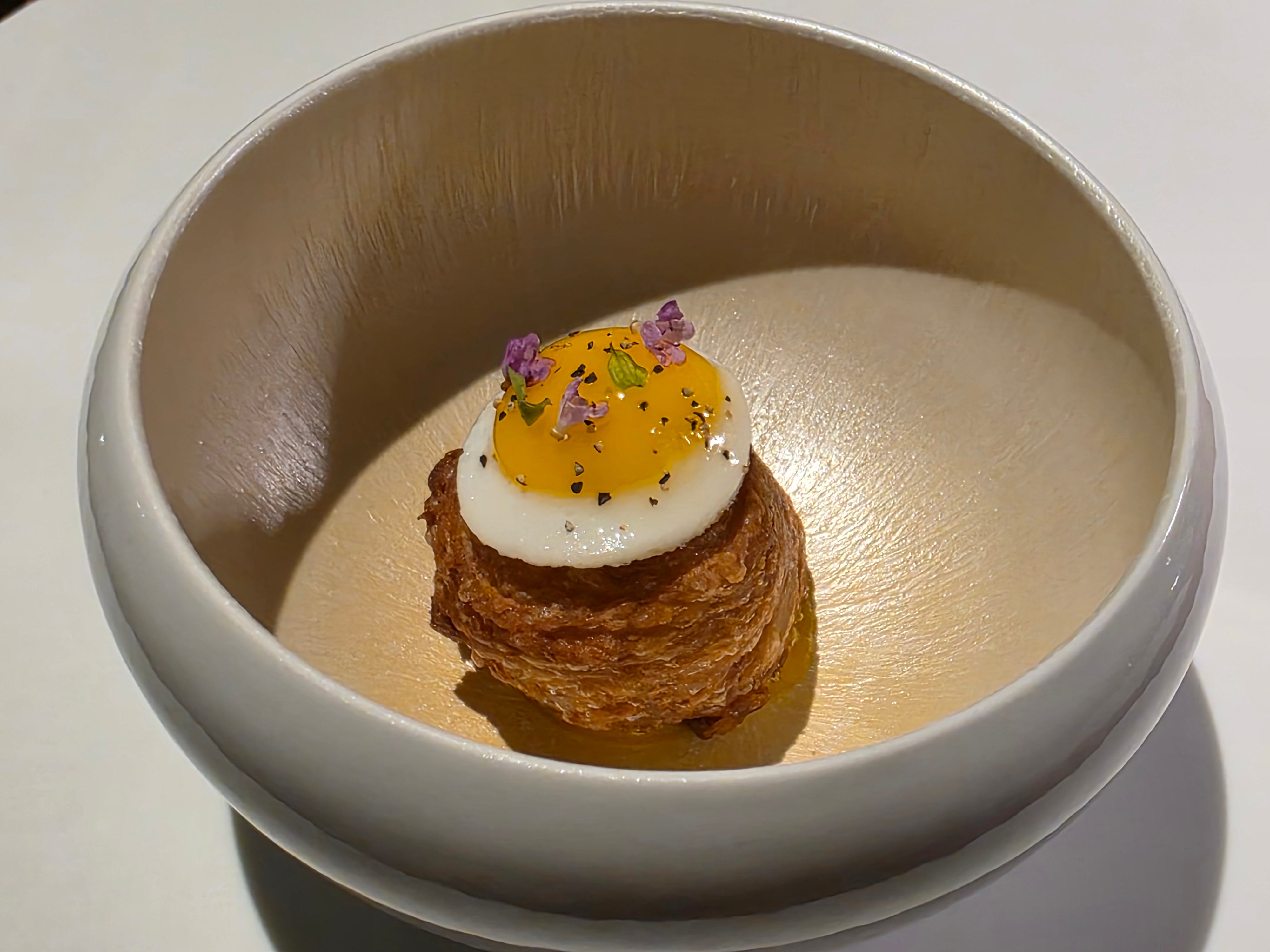 Labyrinth’s take on a lamb prata, a dish from the Indian diaspora in Singapore. A flaky prata ball, stuffed with lamb and cheese and topped with a quail egg, on top of a base of thick raita sauce. Delicious!