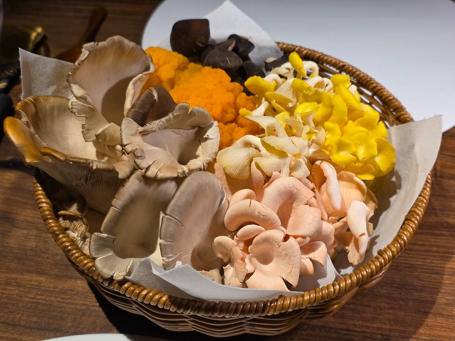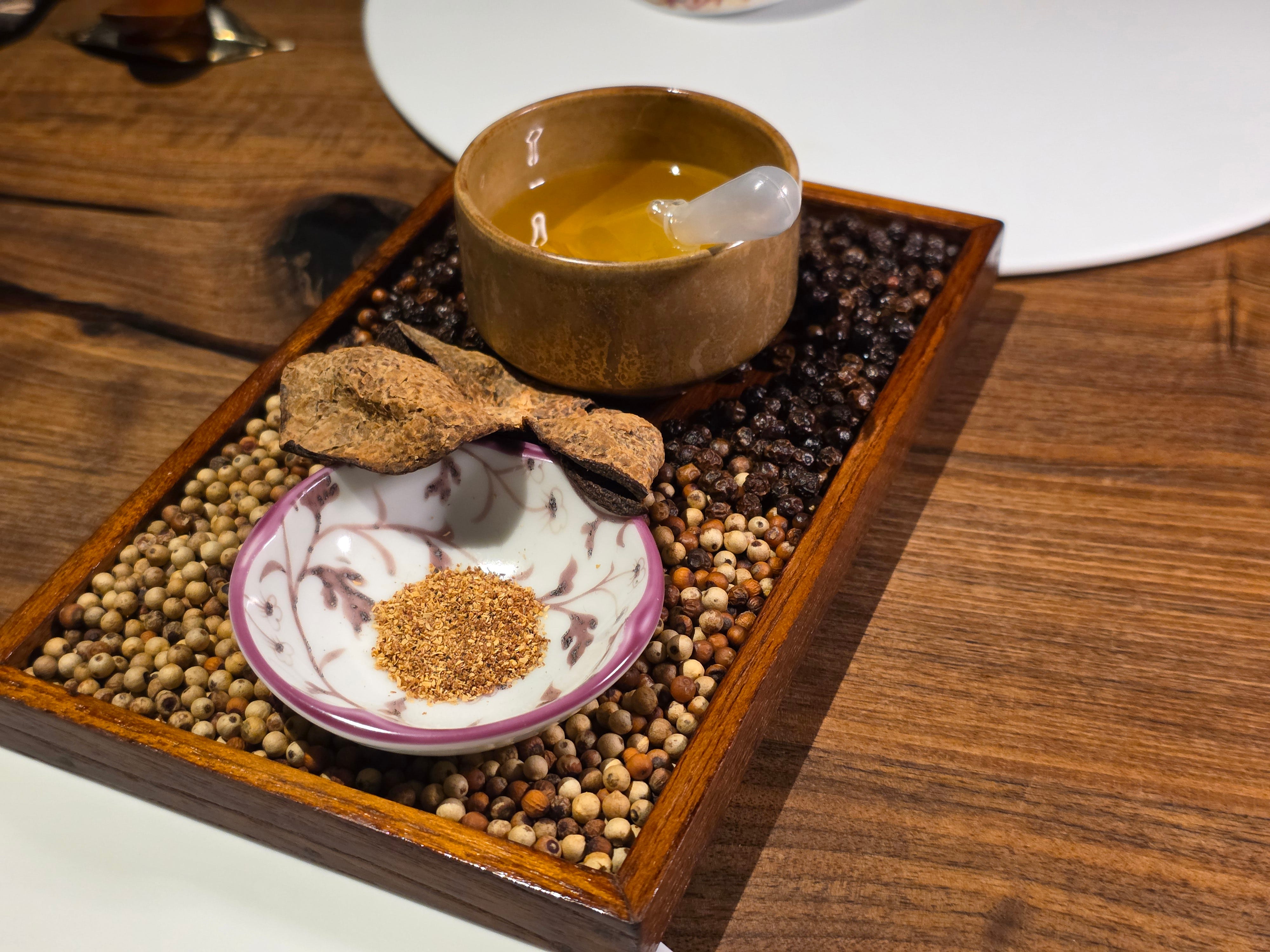 A display of a variety of locally grown mushrooms, kampot pepper oil and dried tangerine peel and other medicinal ingredients used in a very Singaporean first dish.