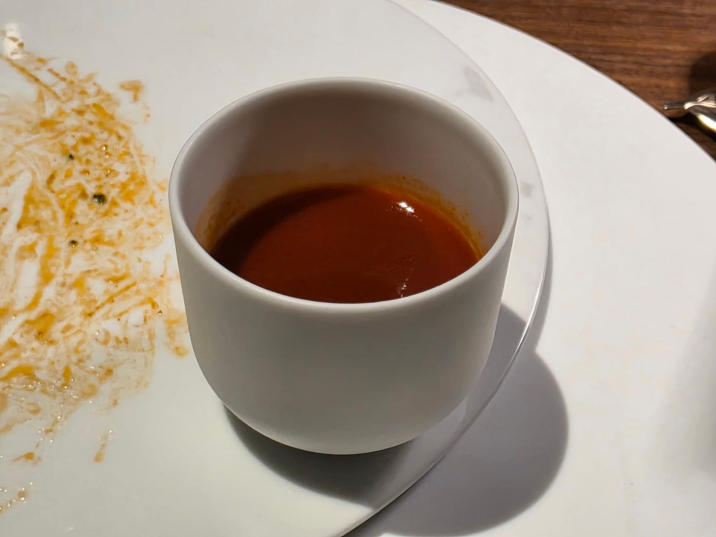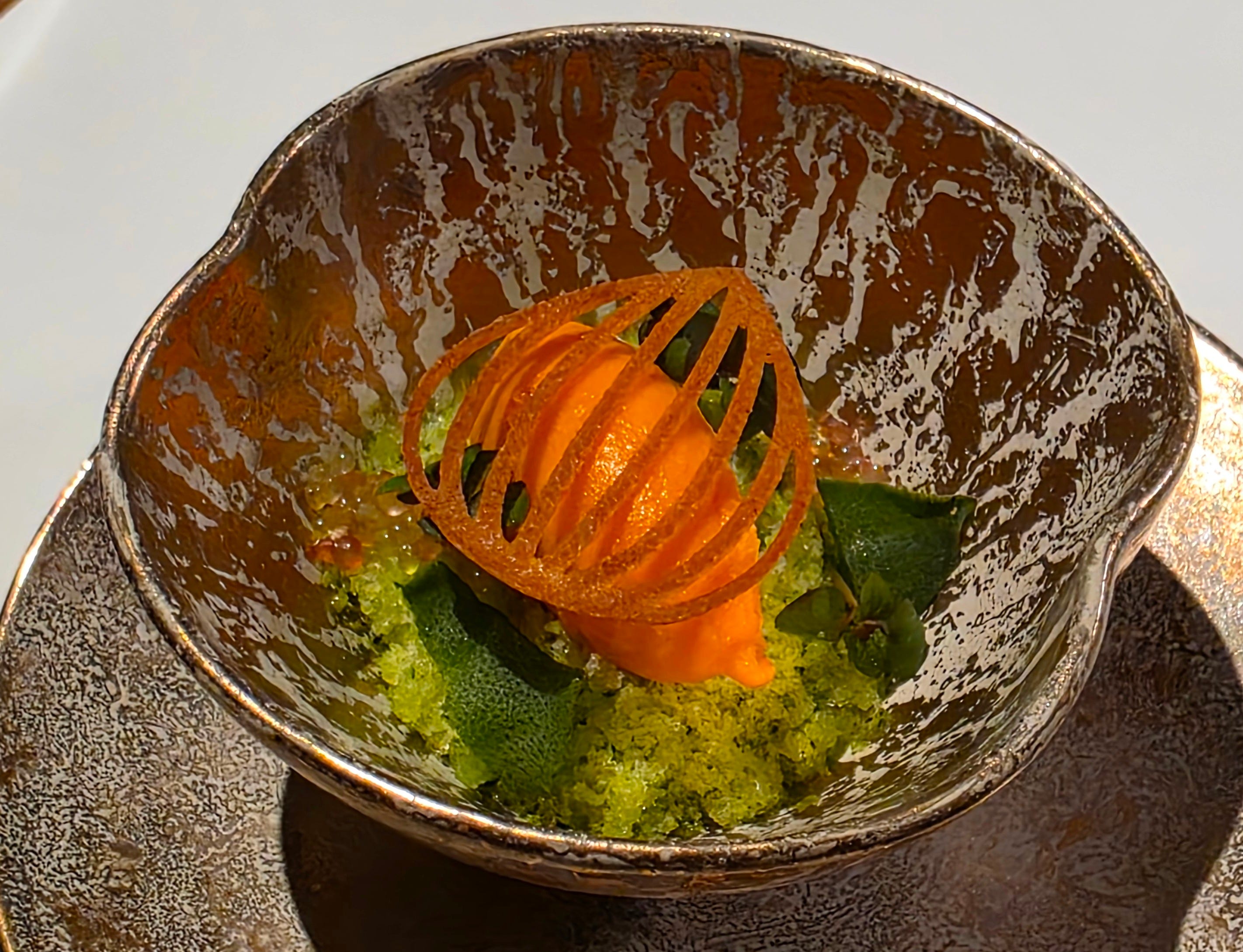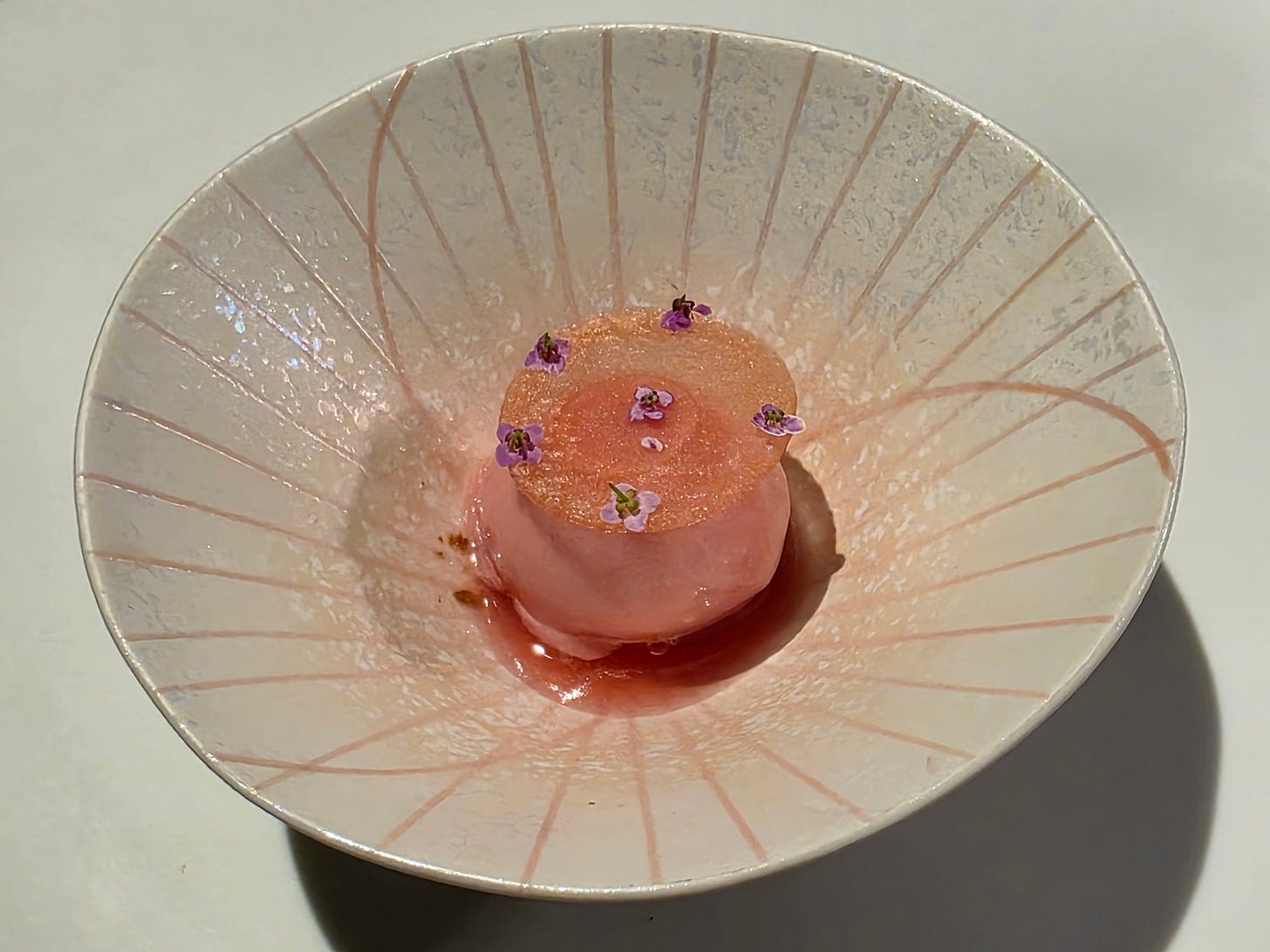 As a palate cleanser, a very unique take on a Rojak, a spicy fruit and vegetable salad. Traditionally a mix of a lot of different ingredients in a sambal, palm sugar and chili sauce, this one was made into a granita base, some beetroot and tomato, and what tasted like a carrot sorbet.
