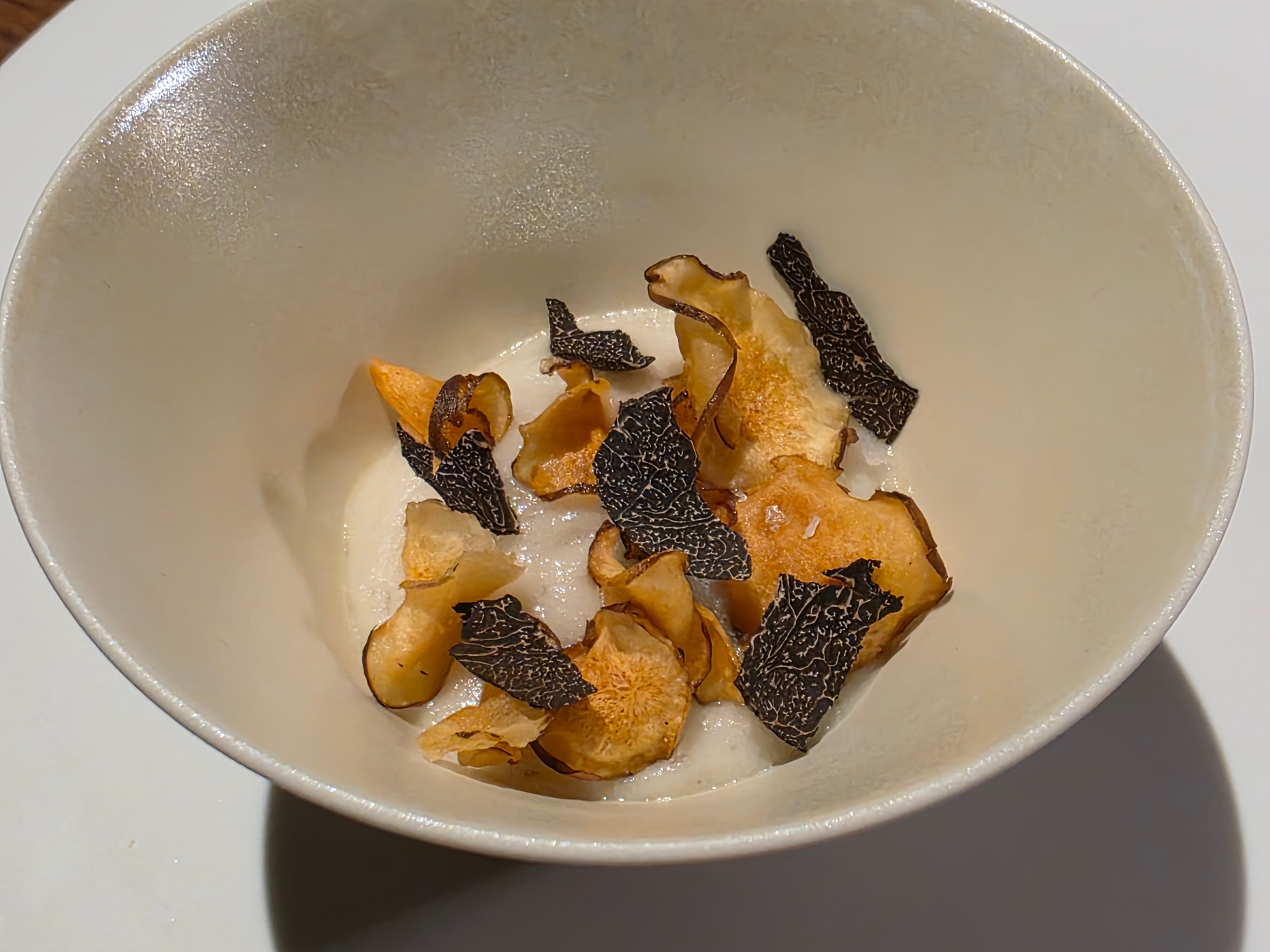 A well-balanced savory and sweet dessert, a Jerusalem artichoke in a light foam and dried into chips, served with black truffle. I didn’t really get this one. It wasn’t bad, but I didn’t really get it as a dessert or the Singaporean connection.