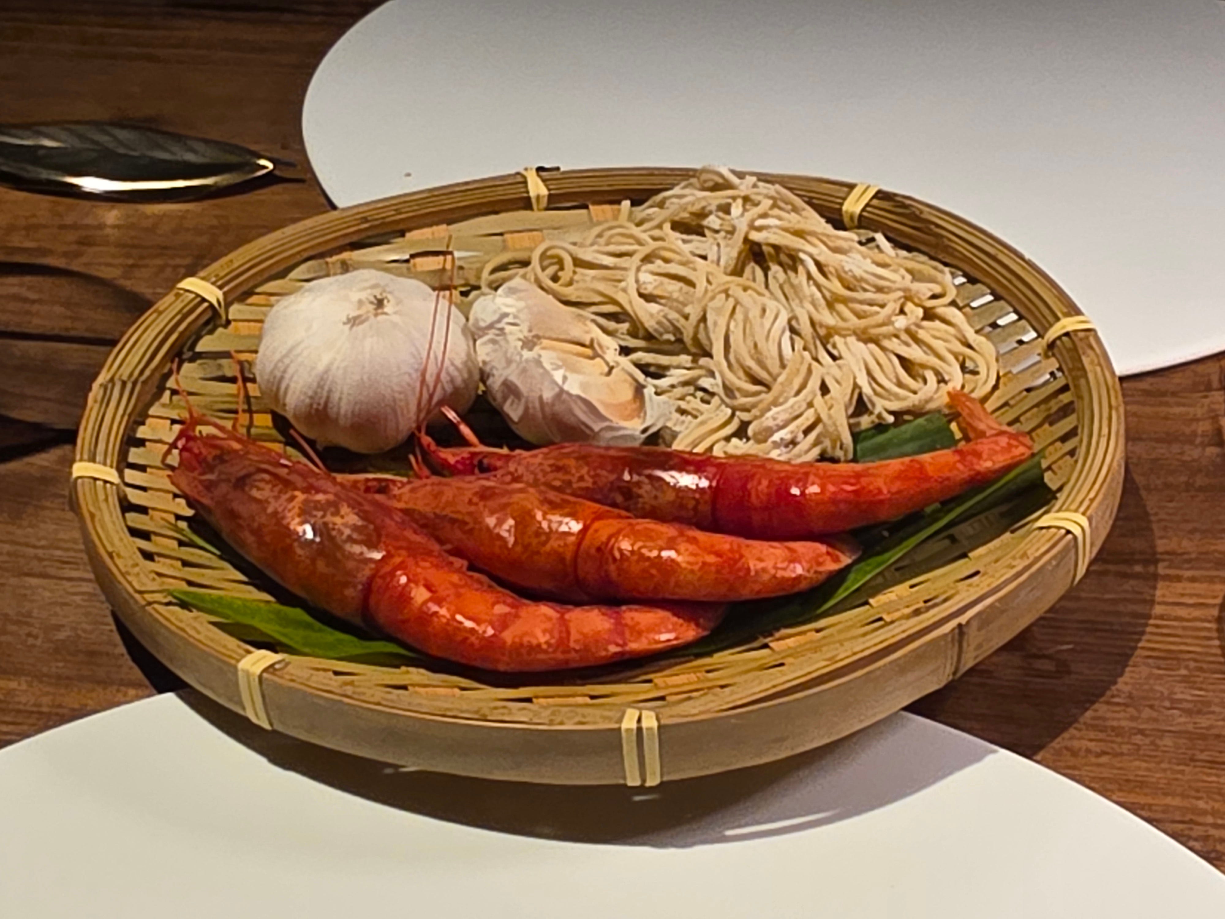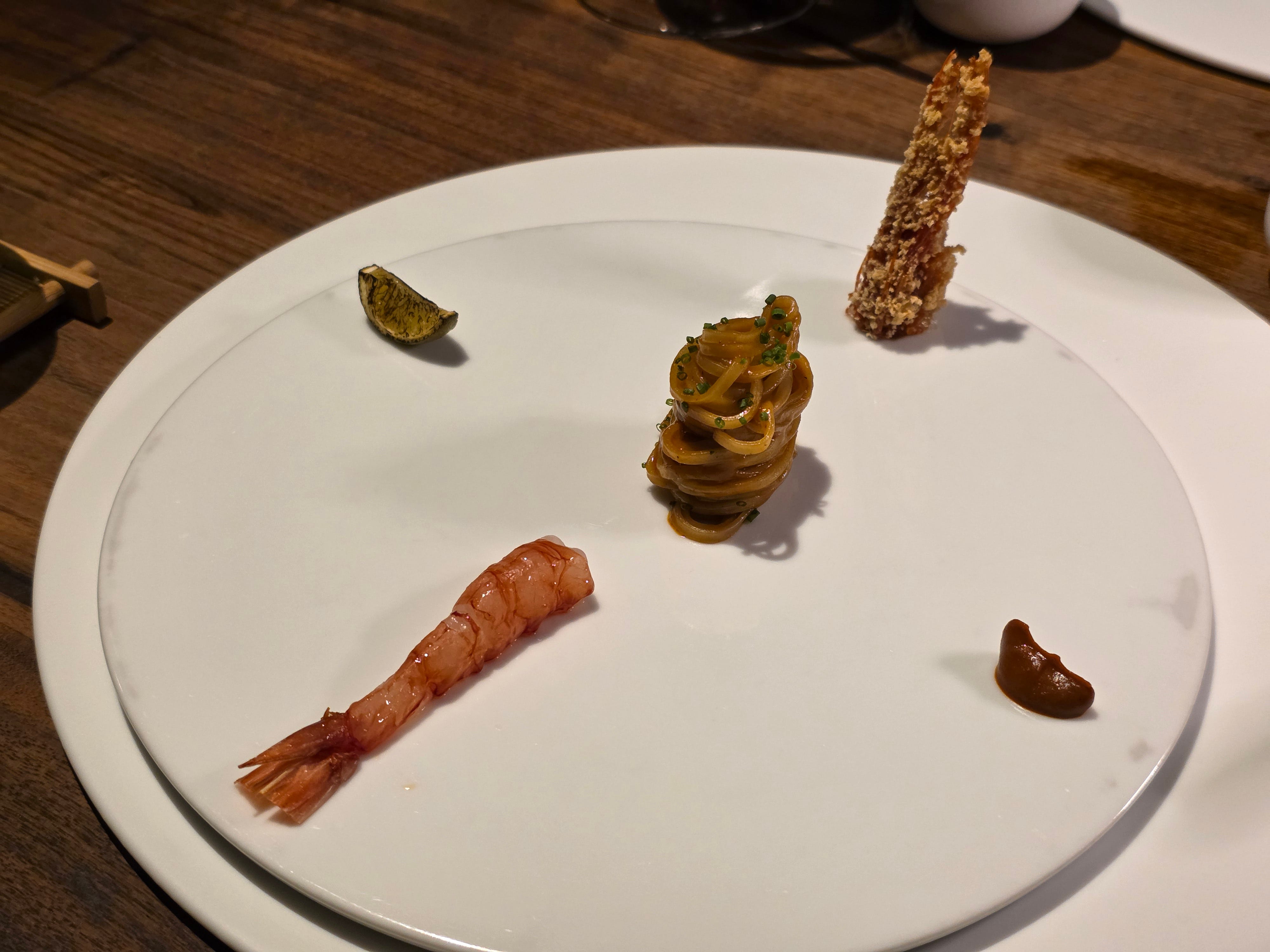 A more refined take on the ever popular Singaporean prawn noodles. Served deconstructed, with a red Sicilian prawn, a small dollop of egg noodles, a dab of sambal, and a thick, rich prawn broth served as an accompaniment.