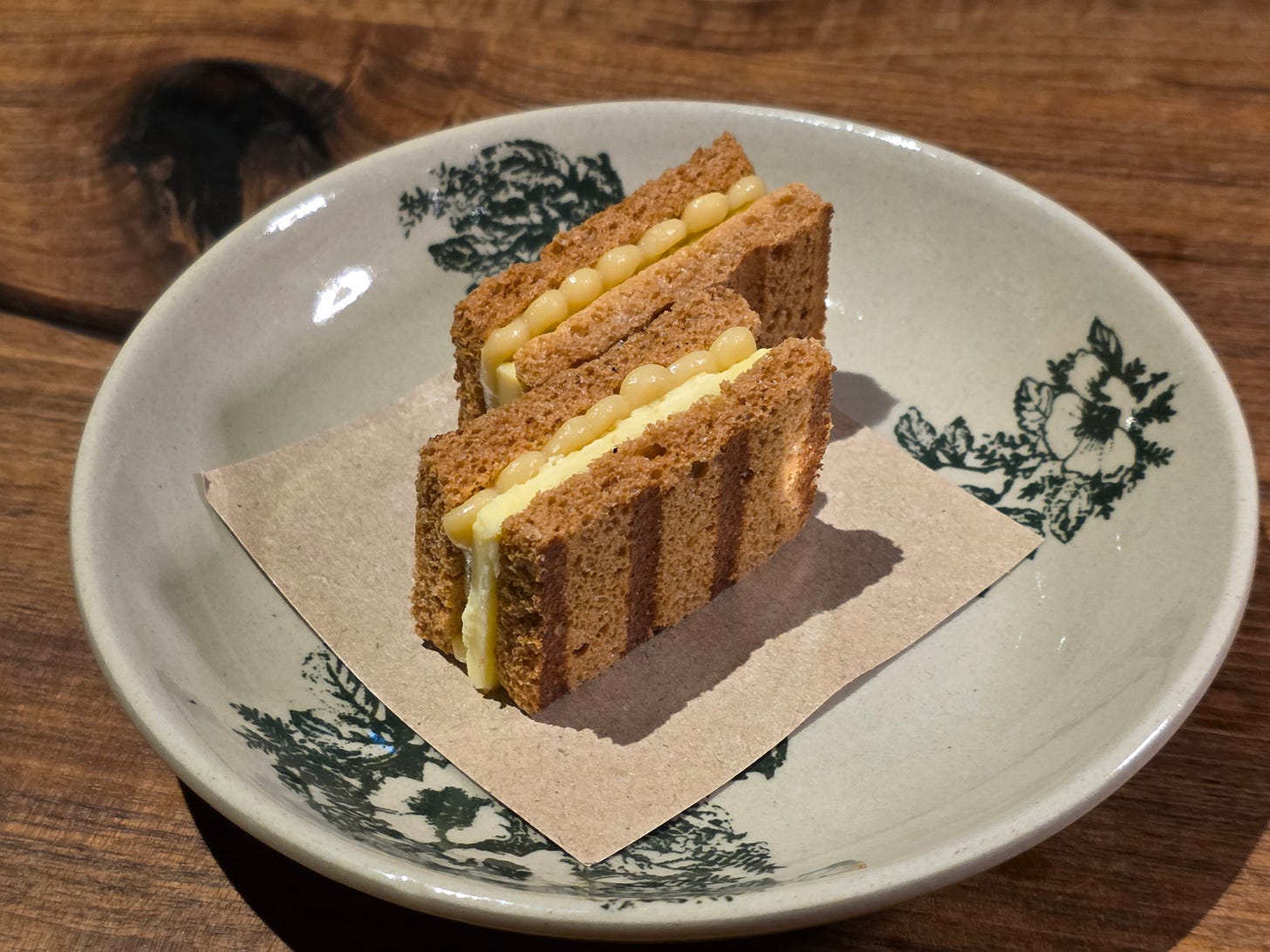 Finally, an unforgettable Singaporean breakfast classic. The kaya toast - with a thick slice of butter and a pandan coconut kaya jam. While looking fairly normal on the surface, the “toast” was actually made from a crispy meringue instead of bread, for an extra crunchy, delicious dessert.