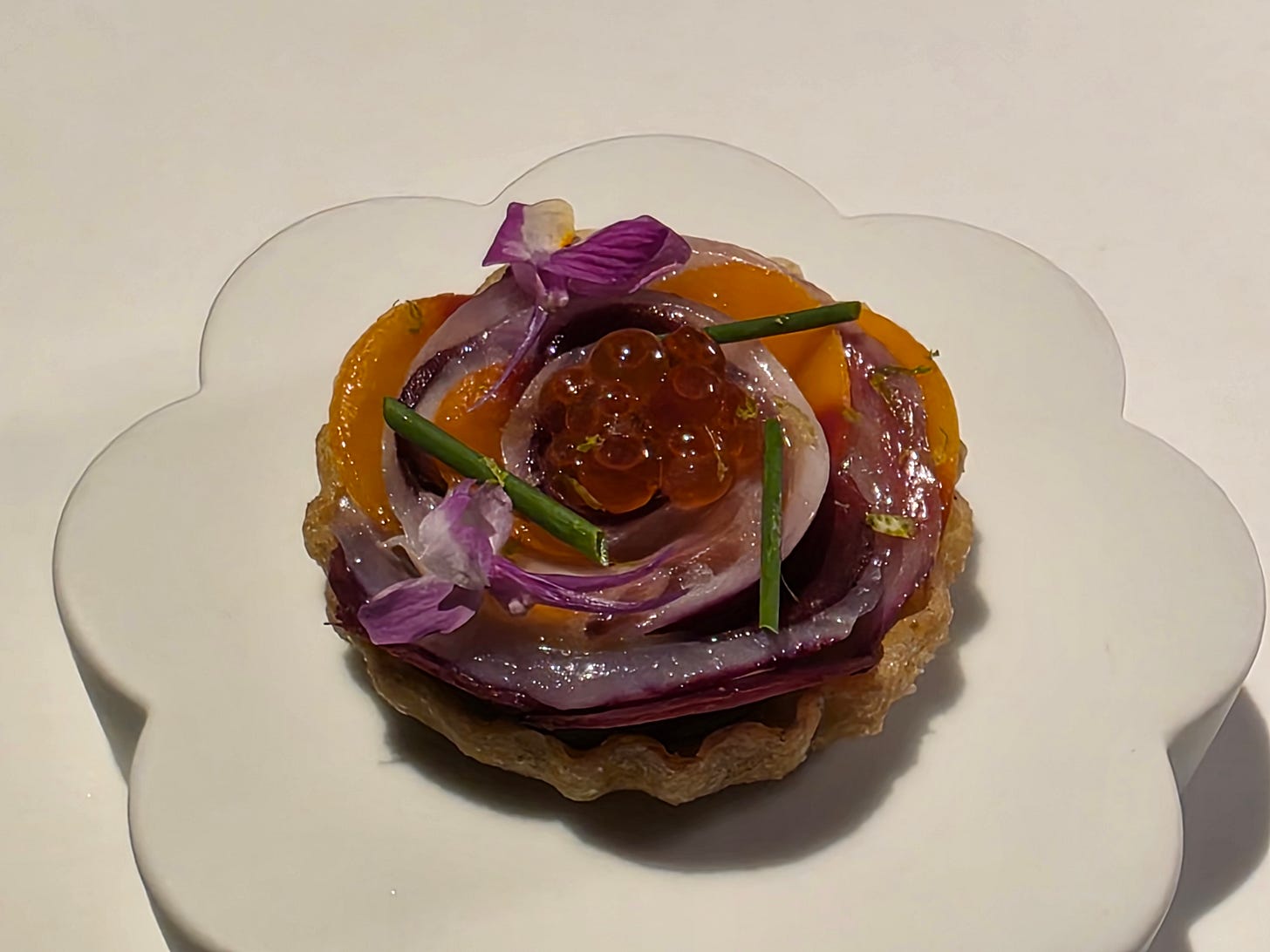 I struggled a bit to see the Singaporean connection in the second dish, which was a tart layered with a striped jack cerviche, pickled vegetables and fish roe in a rose-like shape. Sweet, sour from the pickles, salty from fish roe, a slight hint of fishiness from the striped jack. Really neat combination, despite the lack of an obvious link to Singapore.