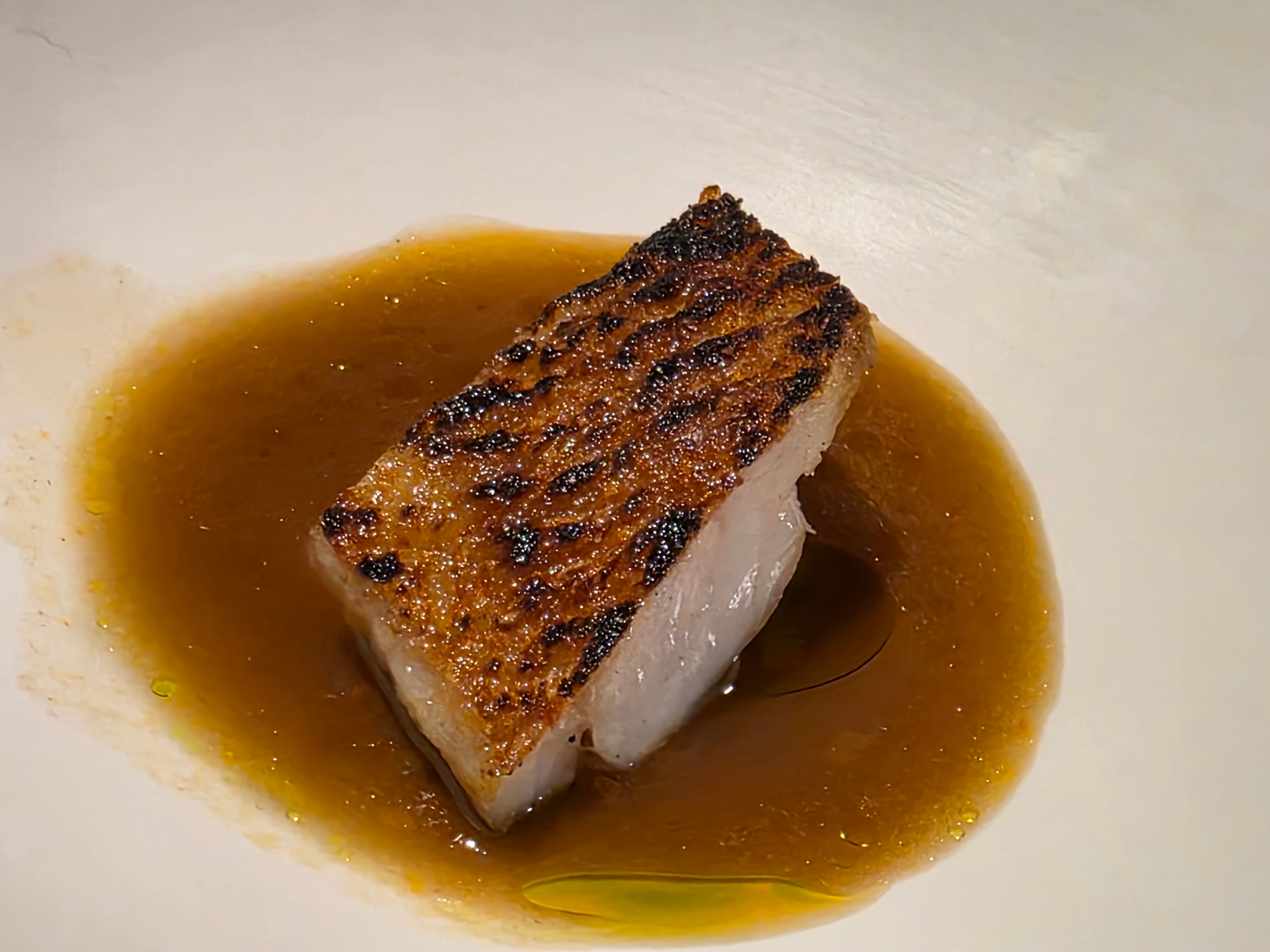 Another highlight of mine, a piece of dry-aged kinki fish, with an incredibly crispy skin, topped with a thin variation on a laksa soup base as the sauce. A huge hit!