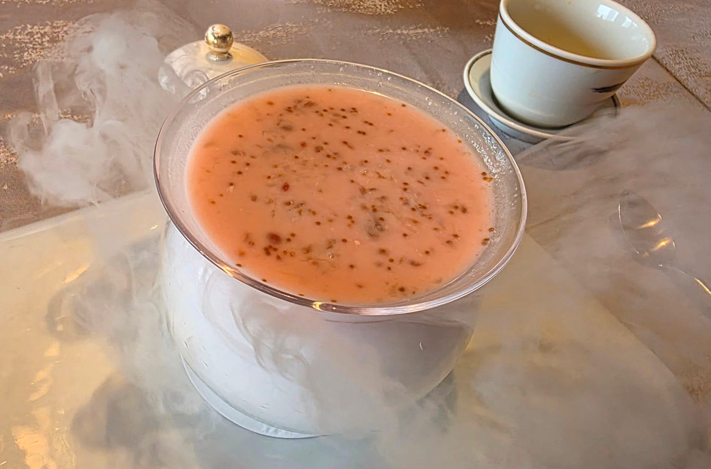 For a theatric dessert, Man Wah’s take on a classic Hong Kong favourite. The classic version of this dessert pairs diced mango chunks, pomelo, tiny sago balls in a chilled soup of mango juice and coconut milk. Allegedly it was first served at a Lei Garden restaurant in Singapore in 1984, but is now a widespread favourite at dessert shops all over Hong Kong. Man Wah reinvents the dessert, replacing the mango with figs and presenting it in a cloud of dry ice.
