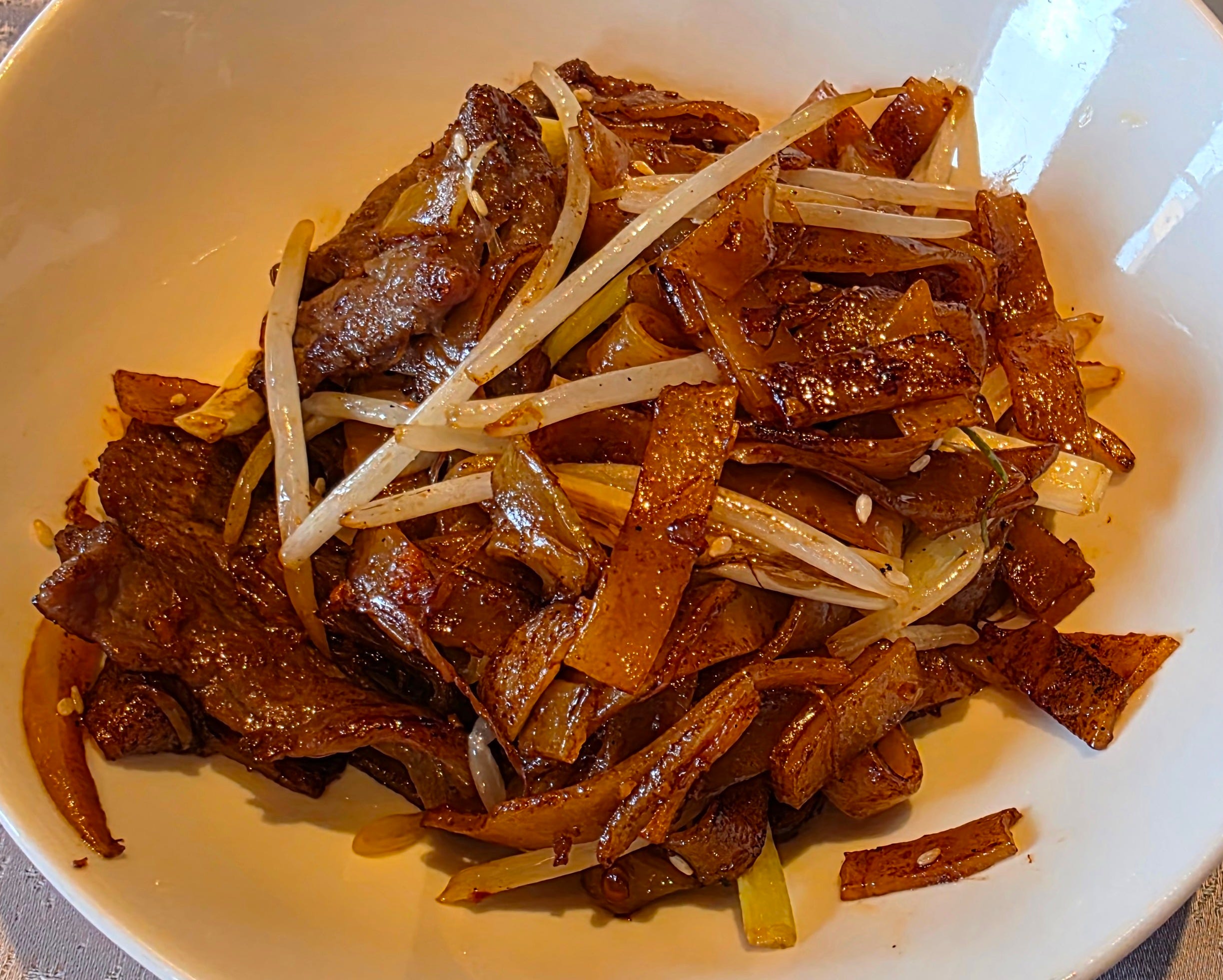 The measure of a good dish of fried noodles is the “wok hei”, literally translated as wok air, something a bit difficult to describe, but you know if when you get it. It’s a combination of smokiness, char and caramelization of the ingredients being actively tossed in a red hot wok under screaming jet burners. It’s something that really marks good Chinese cooking, and is difficult to impossible to recreate outside a commercial kitchen. This version added a bit of homemade XO sauce for a hit of umami and spice, foregoing the pungent mustard that the dish is usually served with.