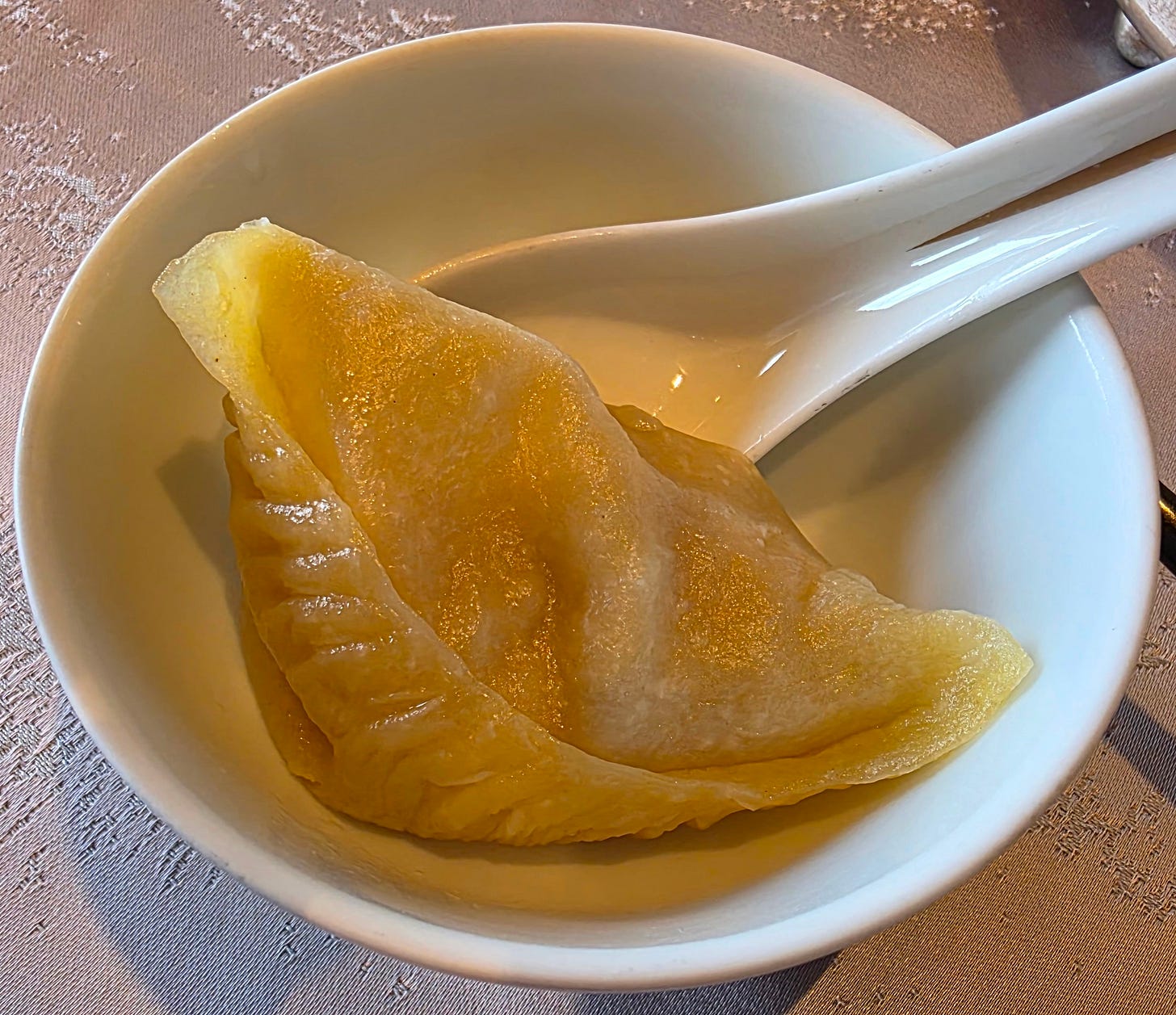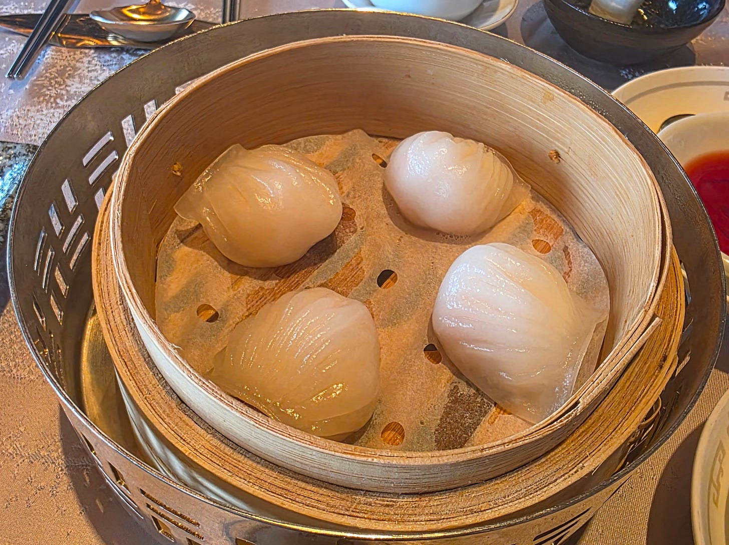 Crystal shrimp dumplings (“har gow”) - a translucent tapioca starch wrapper. The filling highlights the freshness and size of the shrimp, but also includes a bit of bamboo shoot for texture, lard for mouthfeel, a bit of sesame oil for aroma and a variety of seasonings.
