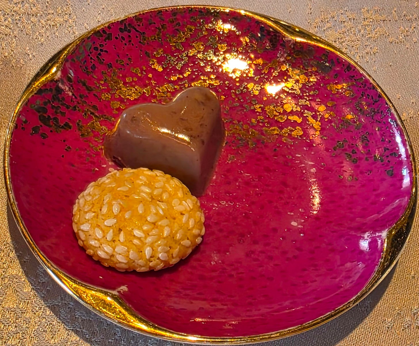 Finally, some petit fours - highlighting two other classic Hong Kong dessert - a red bean sweet soup, made into a jelly, and classical Chinese sesame cookies.