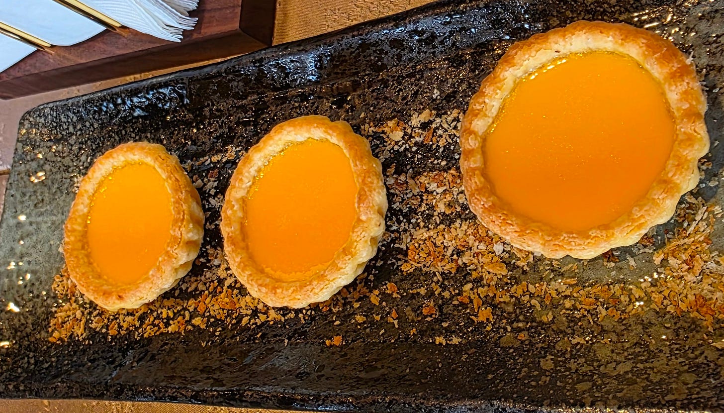 Classic egg tarts (“dan tat”) - a egg custard tart whose history has been lost to time. Countless variations exist - Macau-style Portuguese tarts that caramelize the top, coloured and flavoured custards - using milk, matcha, cheese, chocolate custards in addition to, or instead of the traditional vanilla egg custard, and variations in crust, using a fluffy puff pastry crust or a shortbread-style crust. Hong Kong egg tarts are so iconic that they were recognized as part of Hong Kong’s intangible cultural heritage. Man Wah served a very classical style puff-pastry style crust around a barely set egg custard.