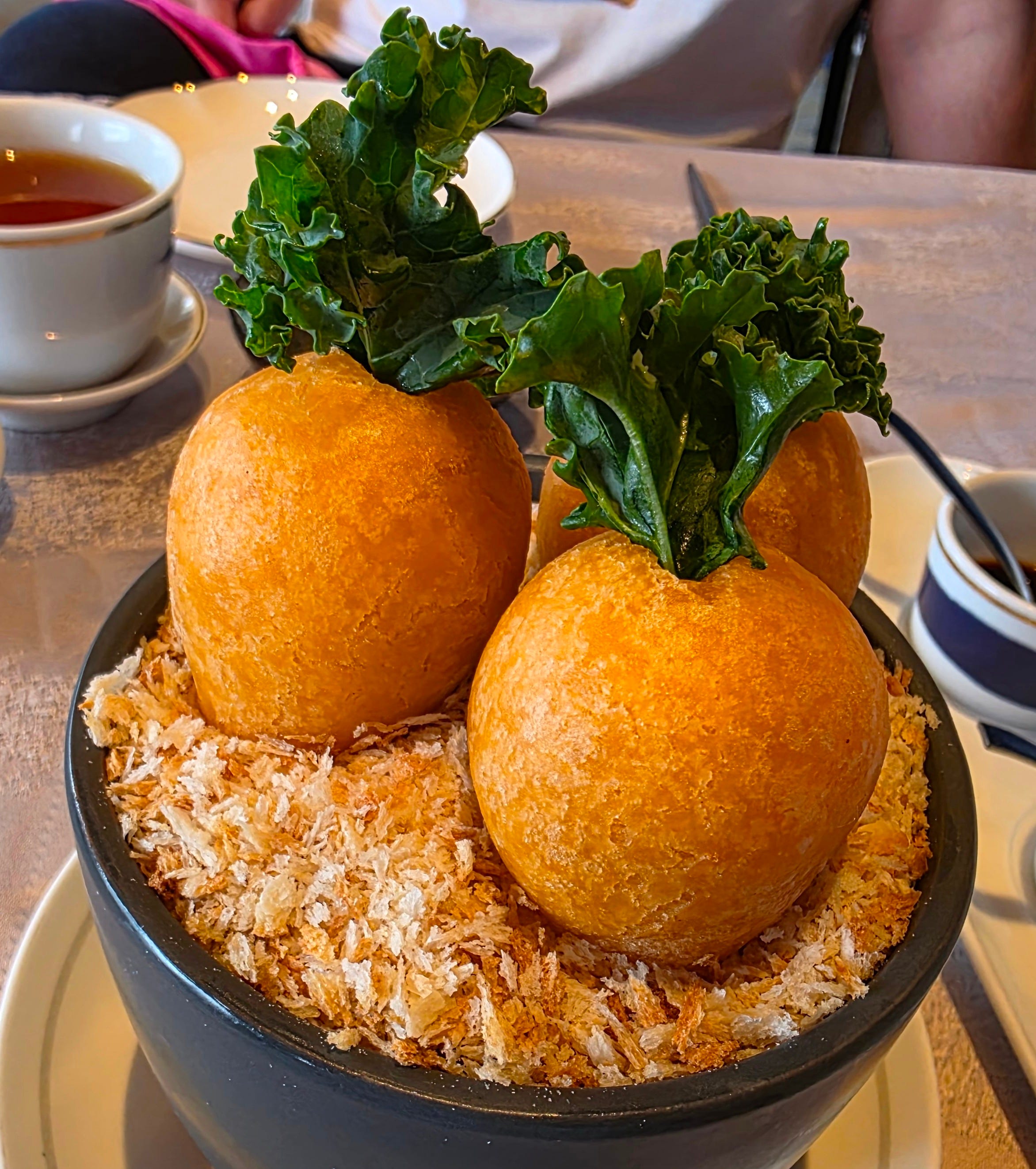 Salt water dumpling (“ham sui gok”) - a similar savory pork mince, but wrapped with a heavy, sticky glutinous rice mochi wrapper. This one was topped with a piece of kale, shaped to a point at the bottom and buried in some breading, making it look like golden brown carrots buried in the dirt. Amusing and delicious!