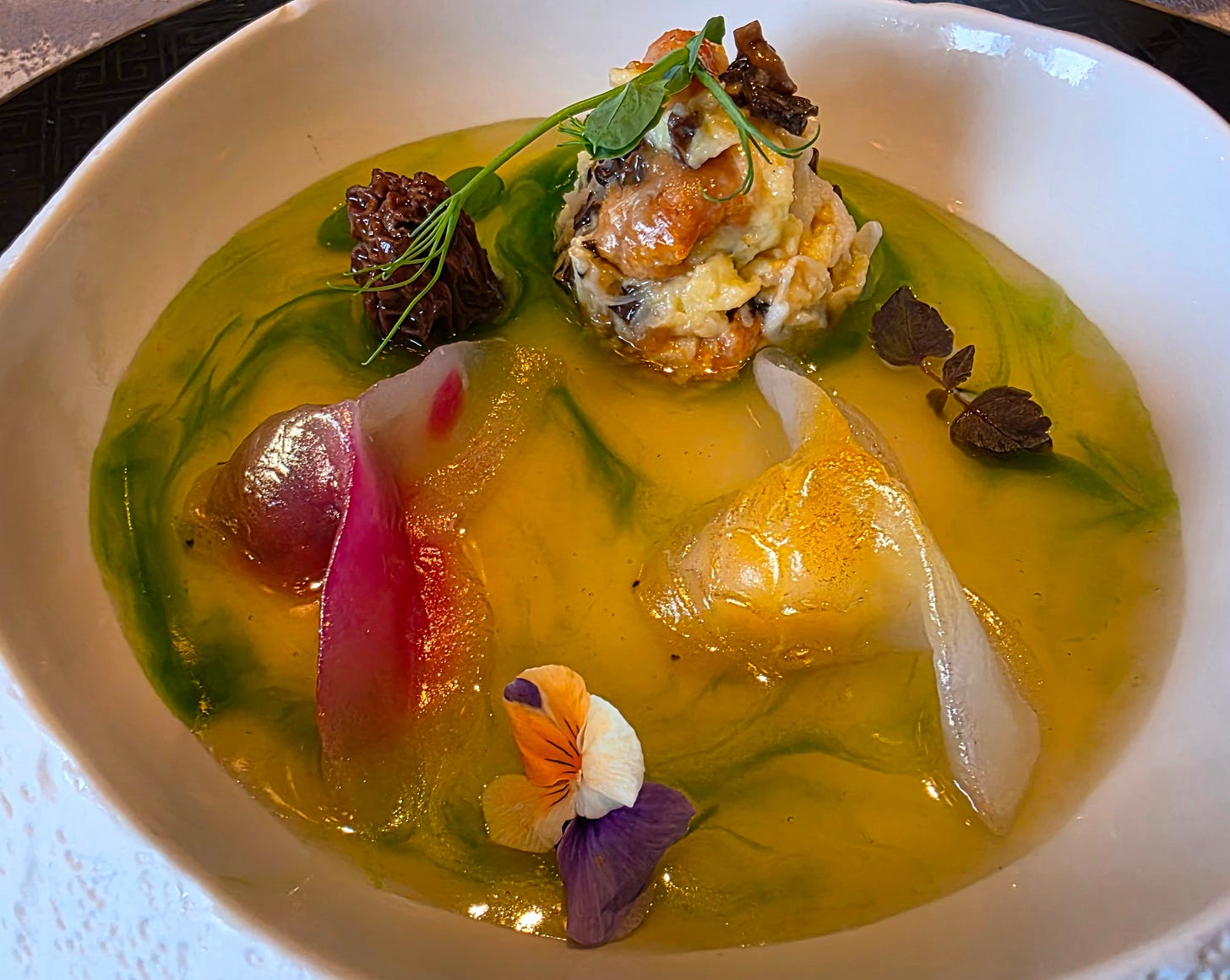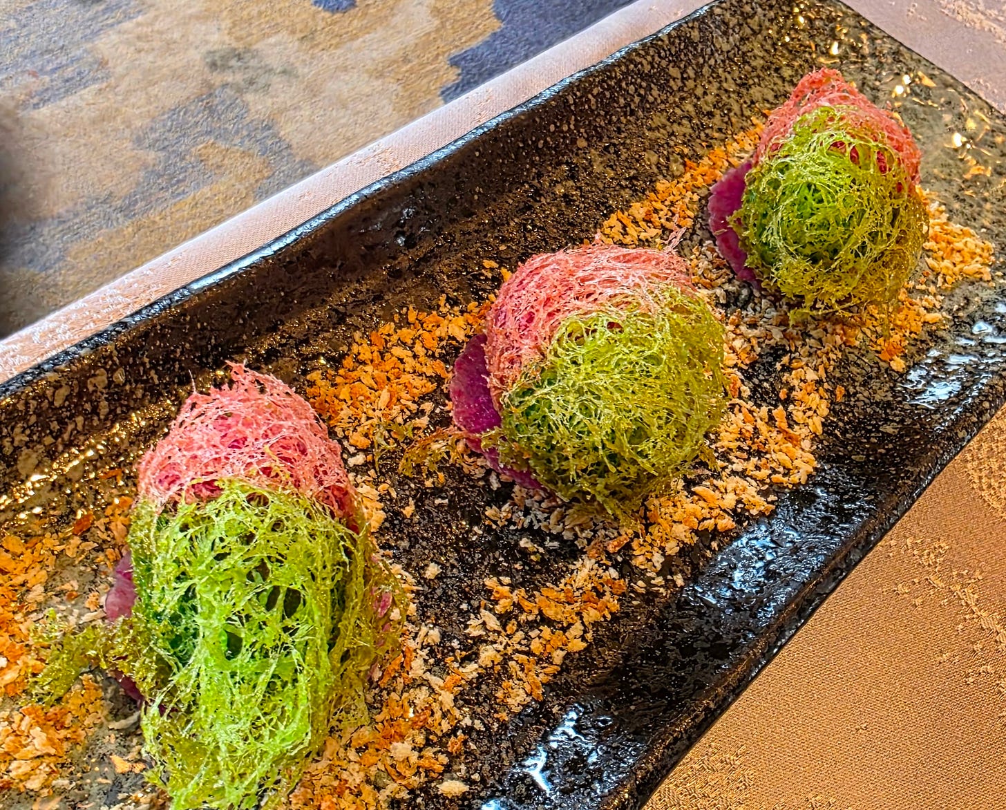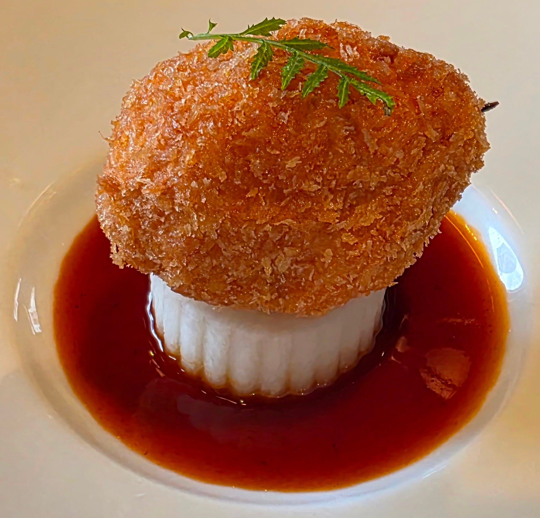 Deep fried taro puffs (“wu gok”) - a savory pork mince surrounded by mashed boiled taro and deep fried. The deep frying creates a fragile but light and crispy exterior. Traditionally, the taro puffs are served fried to a beautiful golden brown, but the more modern version version at Man Wah added diced morel mushrooms and abalone along with the pork mince and were coloured pink and green to look a bit like a puffy radish or strawberry.