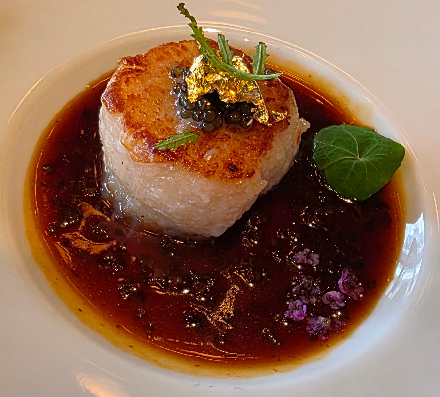 Moving into some dishes that veer away from traditional dim sum, but we tried simply because they looked interesting. A pan-fried Hokkaido scallop, topped with gold flake and caviar in a sticky demi-glace with morel mushrooms. A perfect sear on the scallop, finishing just short of cooked through, pairing well with the savory sauce.