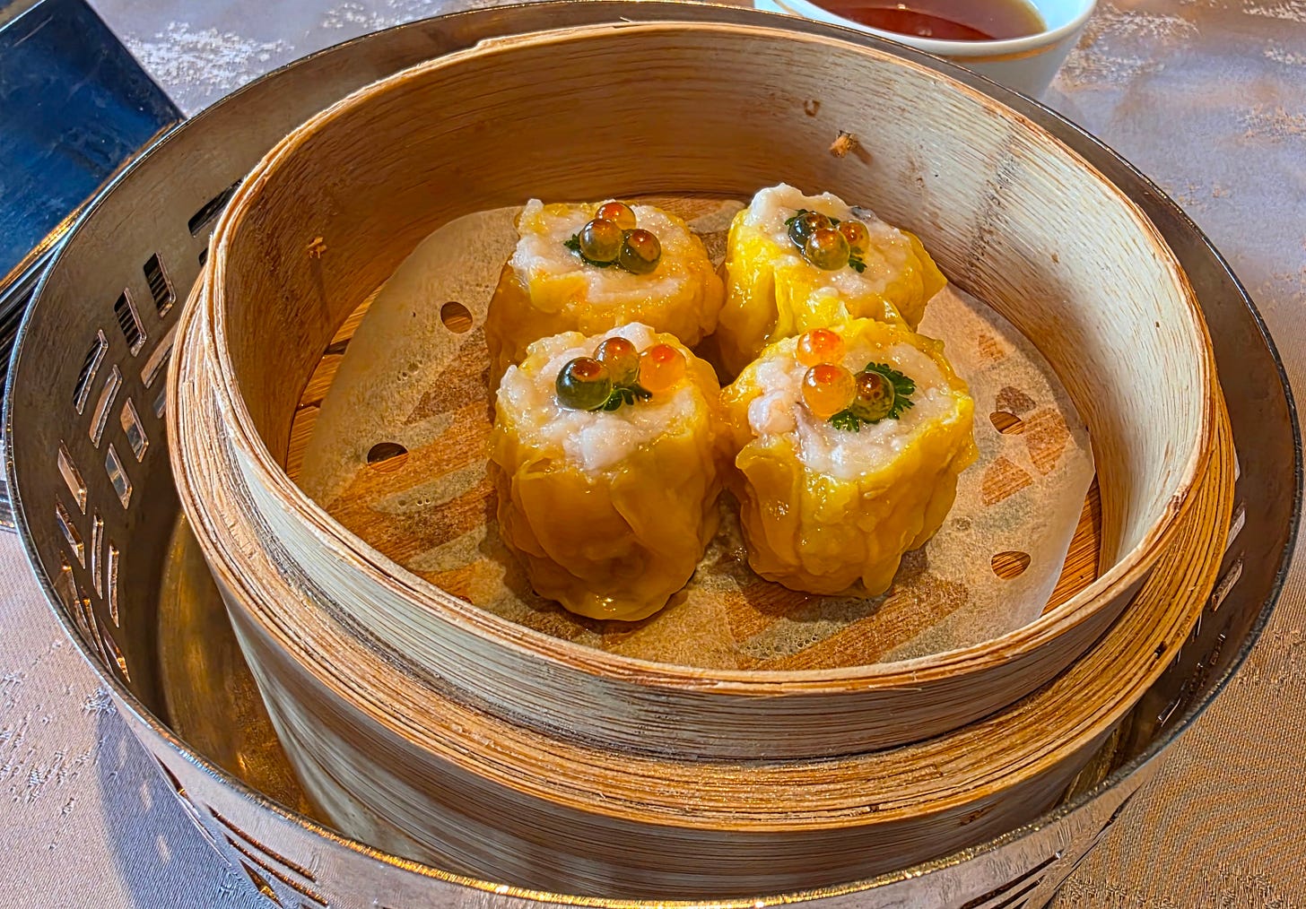 Shrimp and pork dumplings (“siu mai”) - a similar steamed dumpling to the har gow, but with variations on the wrapper and the filling. The wrapper is standard wonton wrapper, surrounding a filling of pork and shrimp. There is a lot of variation in the dish. I’ve seen versions adding water chestnut for a bit of crunch, topped with a scallop of a quail egg. This version was topped with salmon roe and a piece of parsley as a garnish.