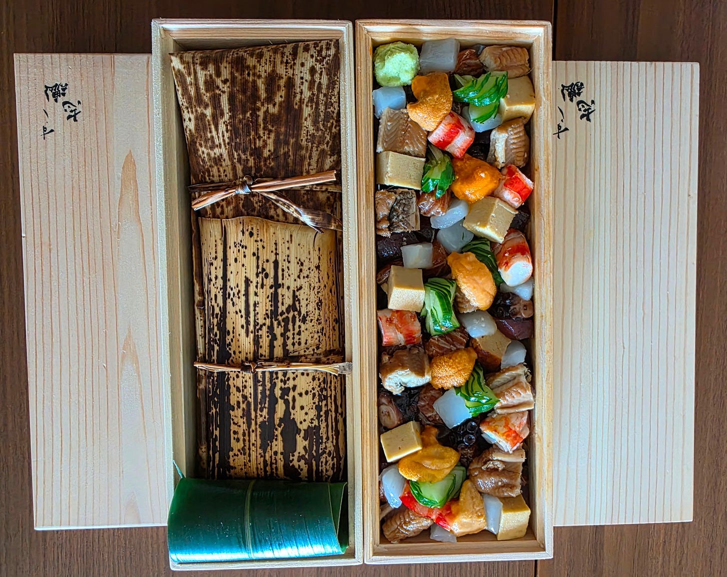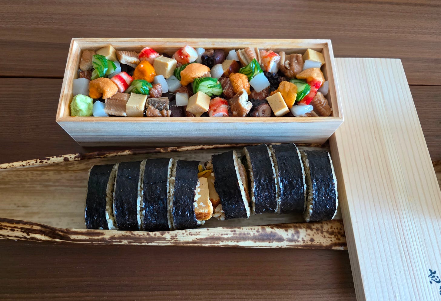 When I found out Shikon still does takeout, I figured I’d find an excuse to try. One order of the chirashi (raw seafood on vinegared rice) and an order of the futomaki (fat sushi roll).