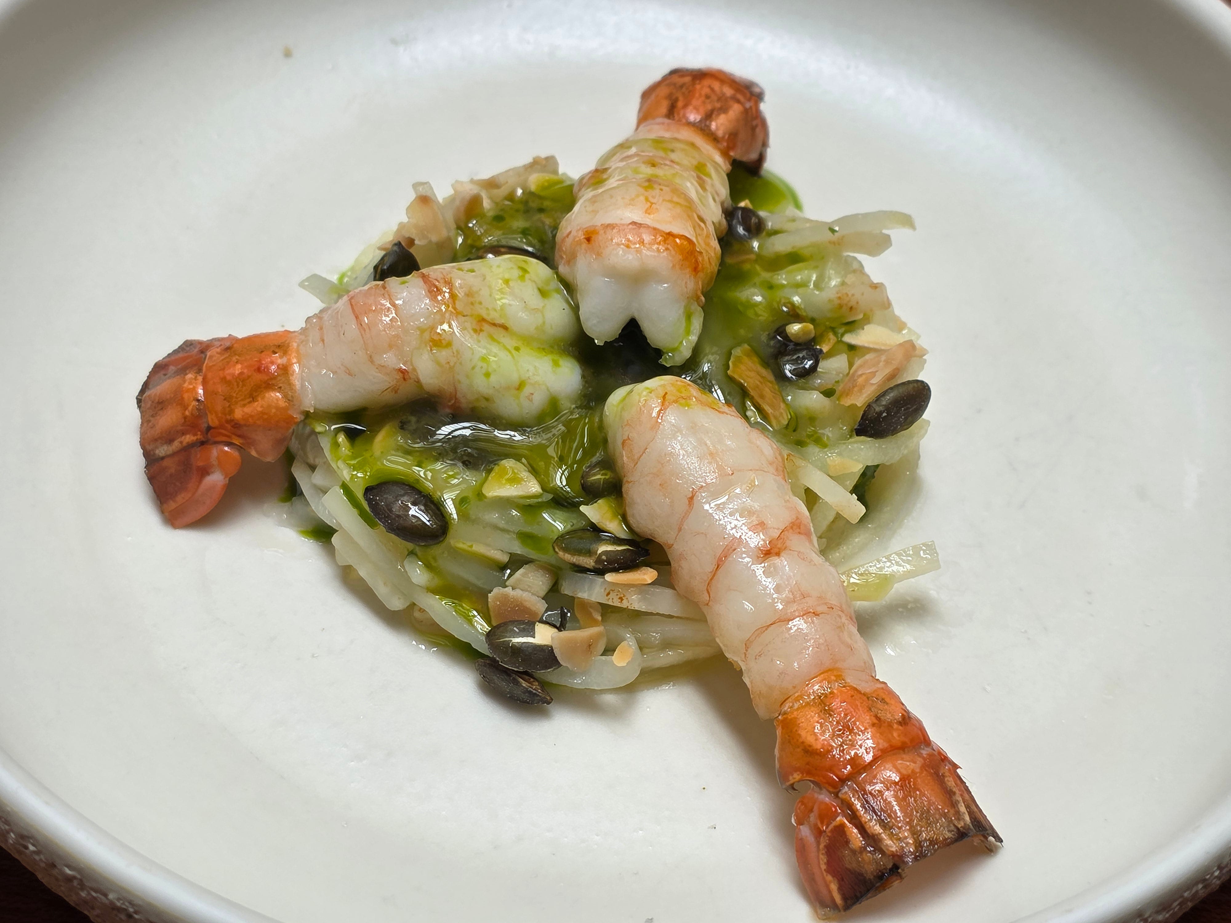 The starter consisted of three langoustine tails, on a bed of grated russet apples, almonds and pumpkin seeds in a verbena lemon dressing.