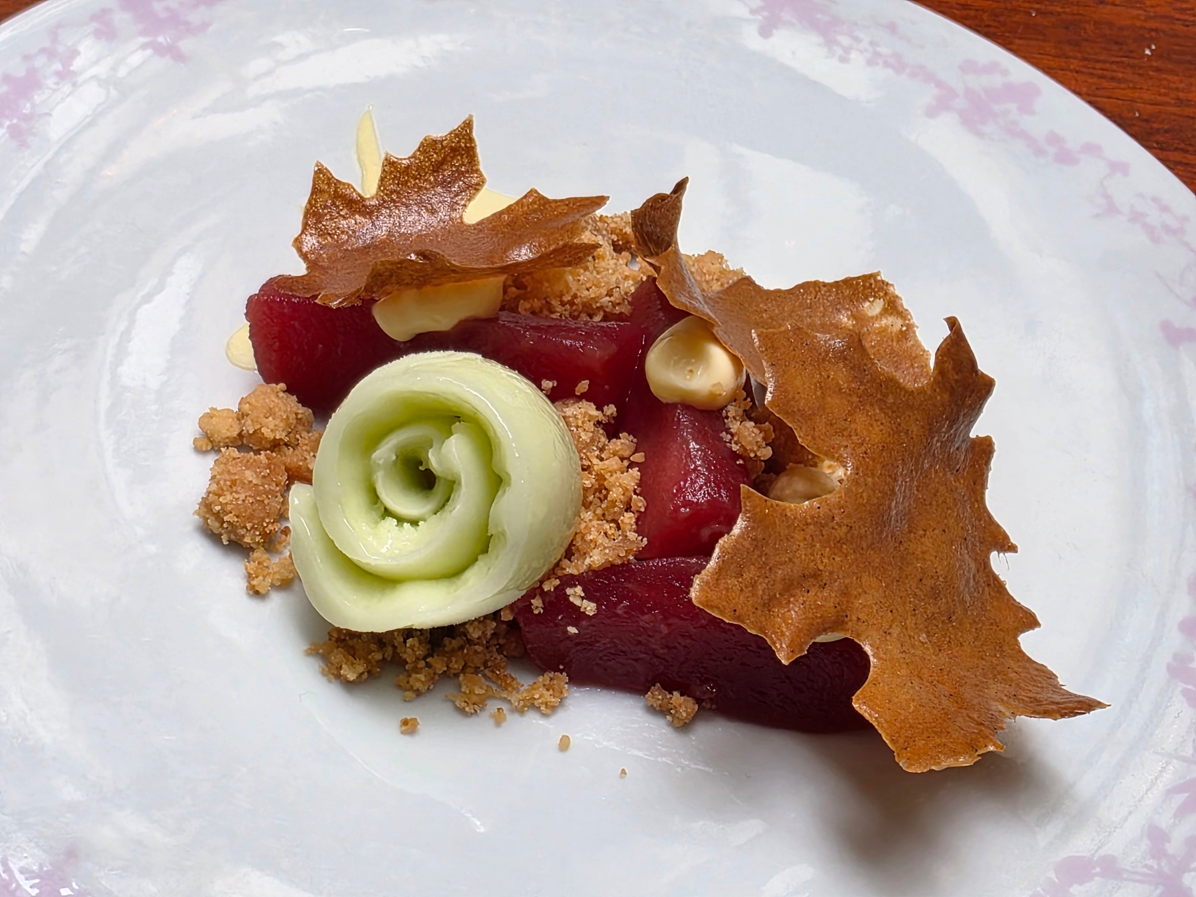 Finally, the dessert - poached Braeburn apples with an almond crumble, hazelnuts and a lemon ice cream. Topping the apples were thin maple leaves made from caramelized sugar. Absolutely delicious.