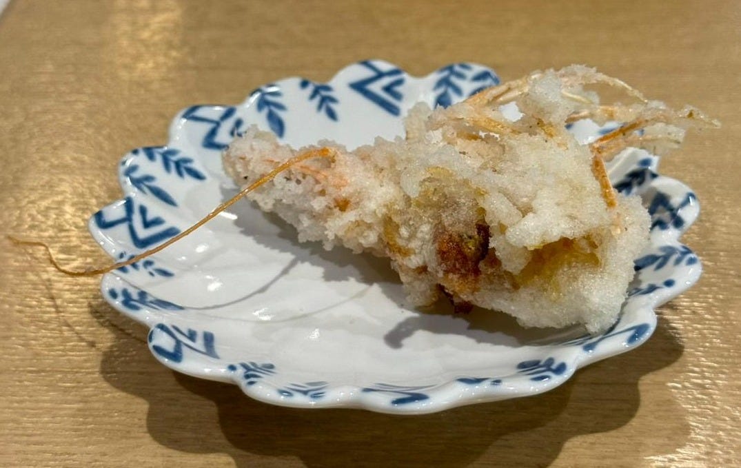 Leaving nothing to waste, the head of the Botan shrimp was deep fried and presented to use on a plate.