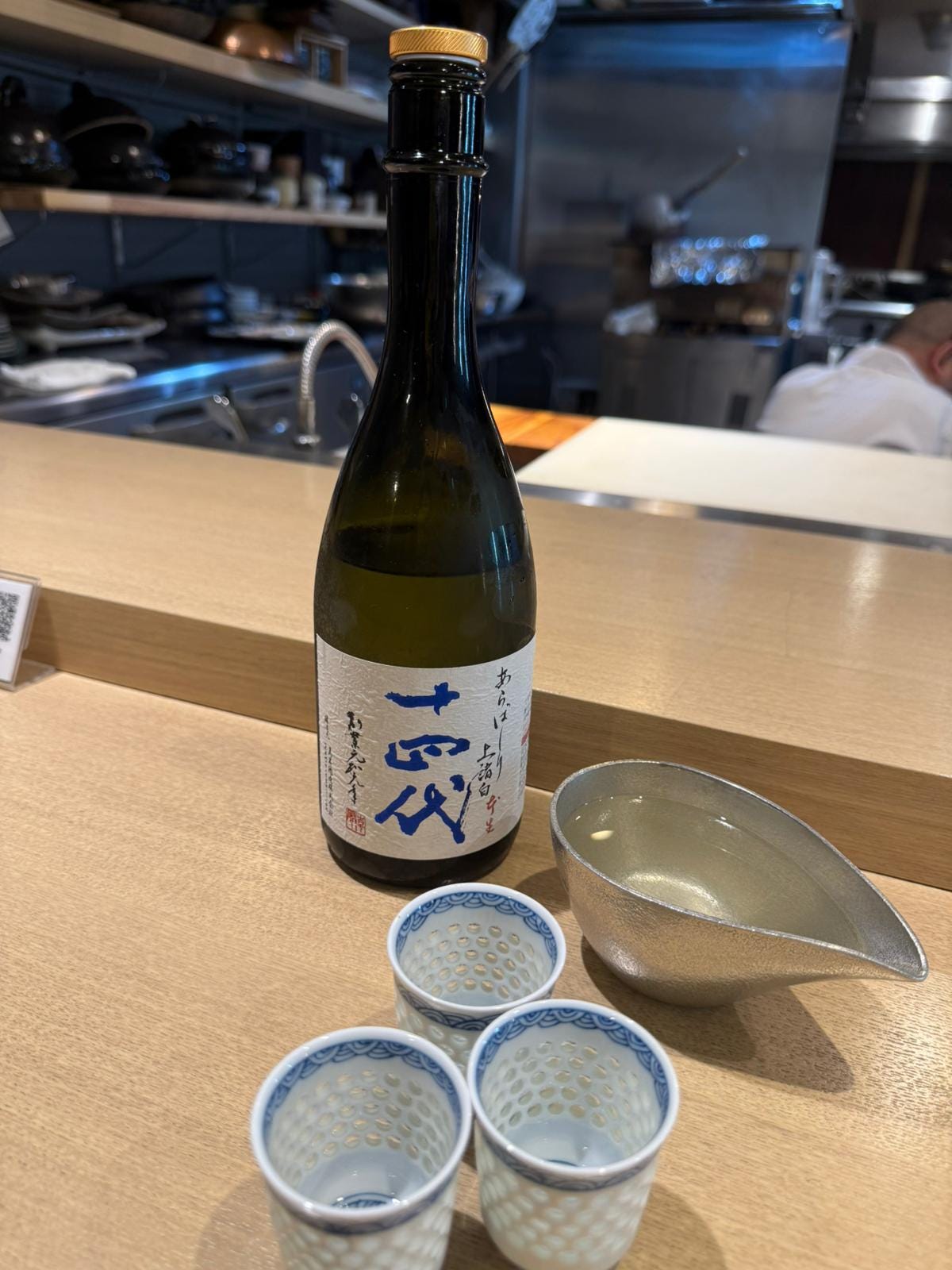 Of course, dinner began with sake. A companion chose a Juyondai Honmaru, supposed to be the top sake brand in Japan from one of the oldest breweries in Japan. With over 400 years of history, the name Honmaru means “original one”. Sweet, floral, fruity, crisp. I was a pretty big fan.