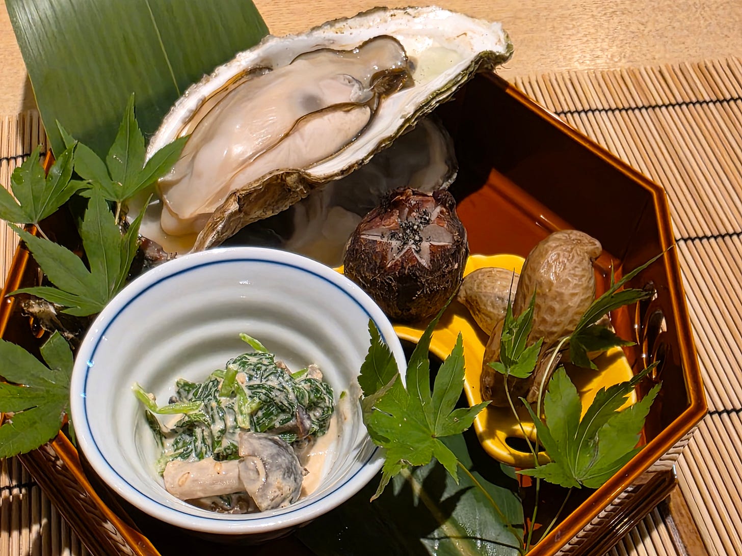 After missing the picture of the amuse bouche, a sesame-infused block of tofu, I got a picture of the appetizer - spinach and seasonal mushrooms in a sesame dressing, a poached Hokkaido oyster, a starchy arrow-root like Japanese vegetable, and two of the largest boiled peanuts I’ve ever seen.