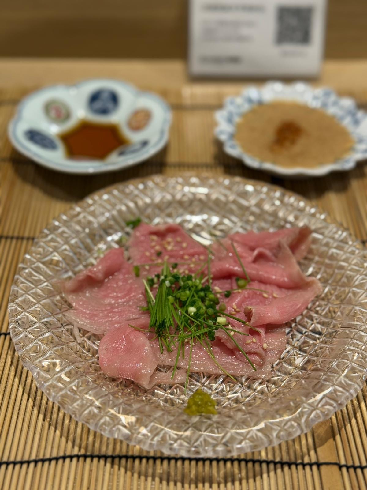 To open up our appetite, two thing slices of black Hiroshima A5 wagyu, richly fat-marbled, thinly-sliced, barely poached and served with a sesame dip and ponzu sauce, as well as a generous topping of chives.