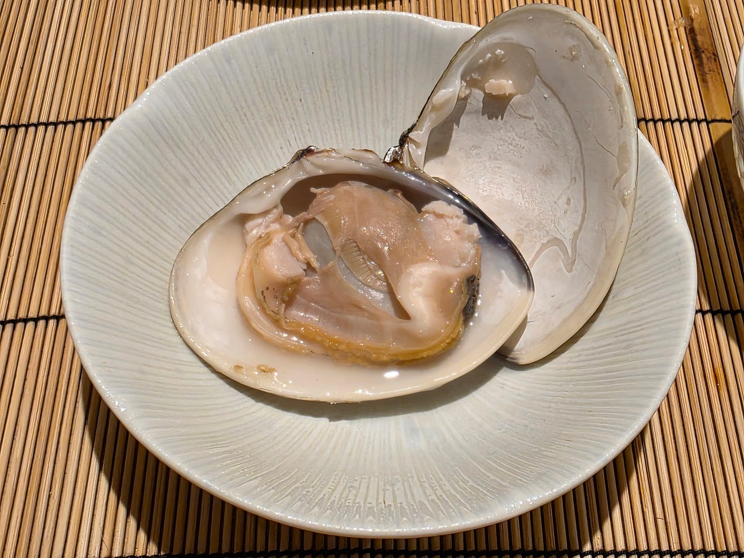 A giant poached clam for intermission while the chef hurriedly picked the rest of the crabs.