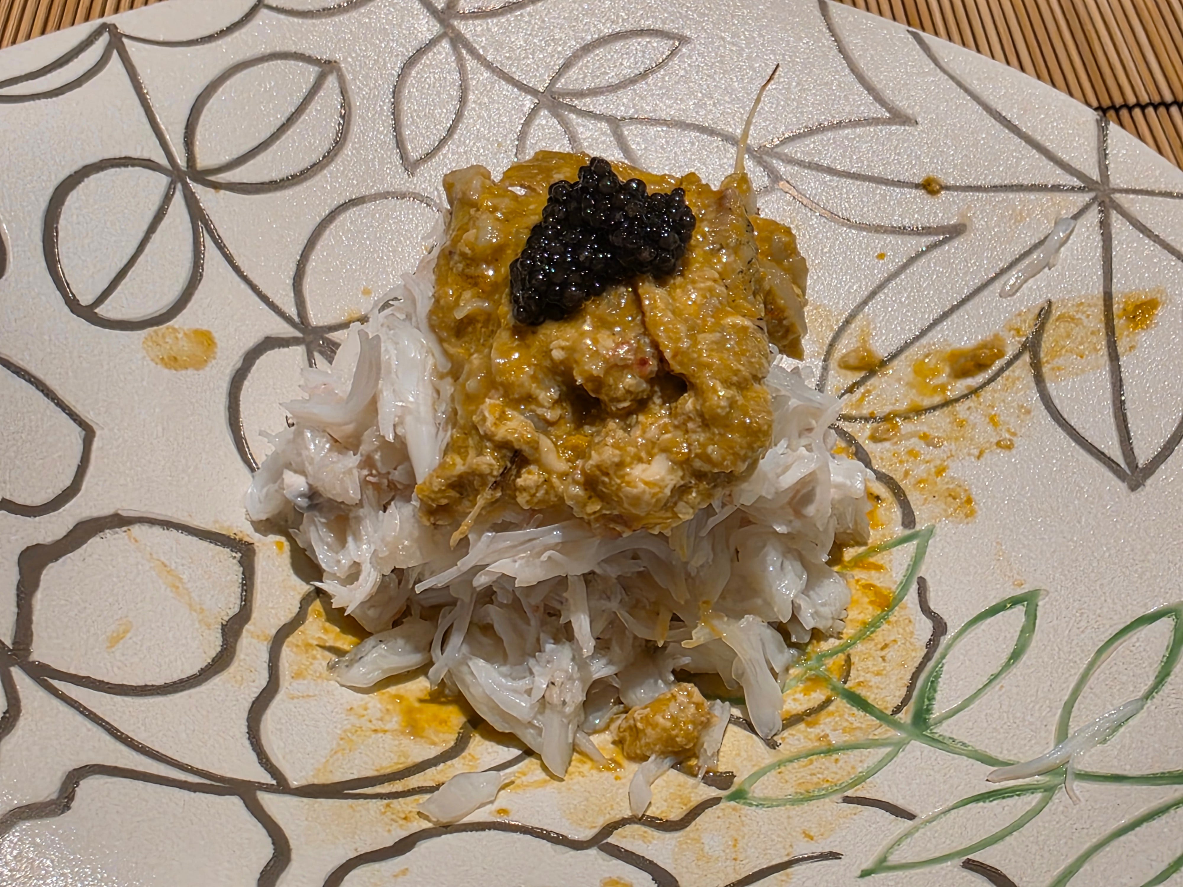 Next, a hairy crab leg poached with the crab juices in the crab shell directly on top of a burner, topped with a generous helping of crab roe.