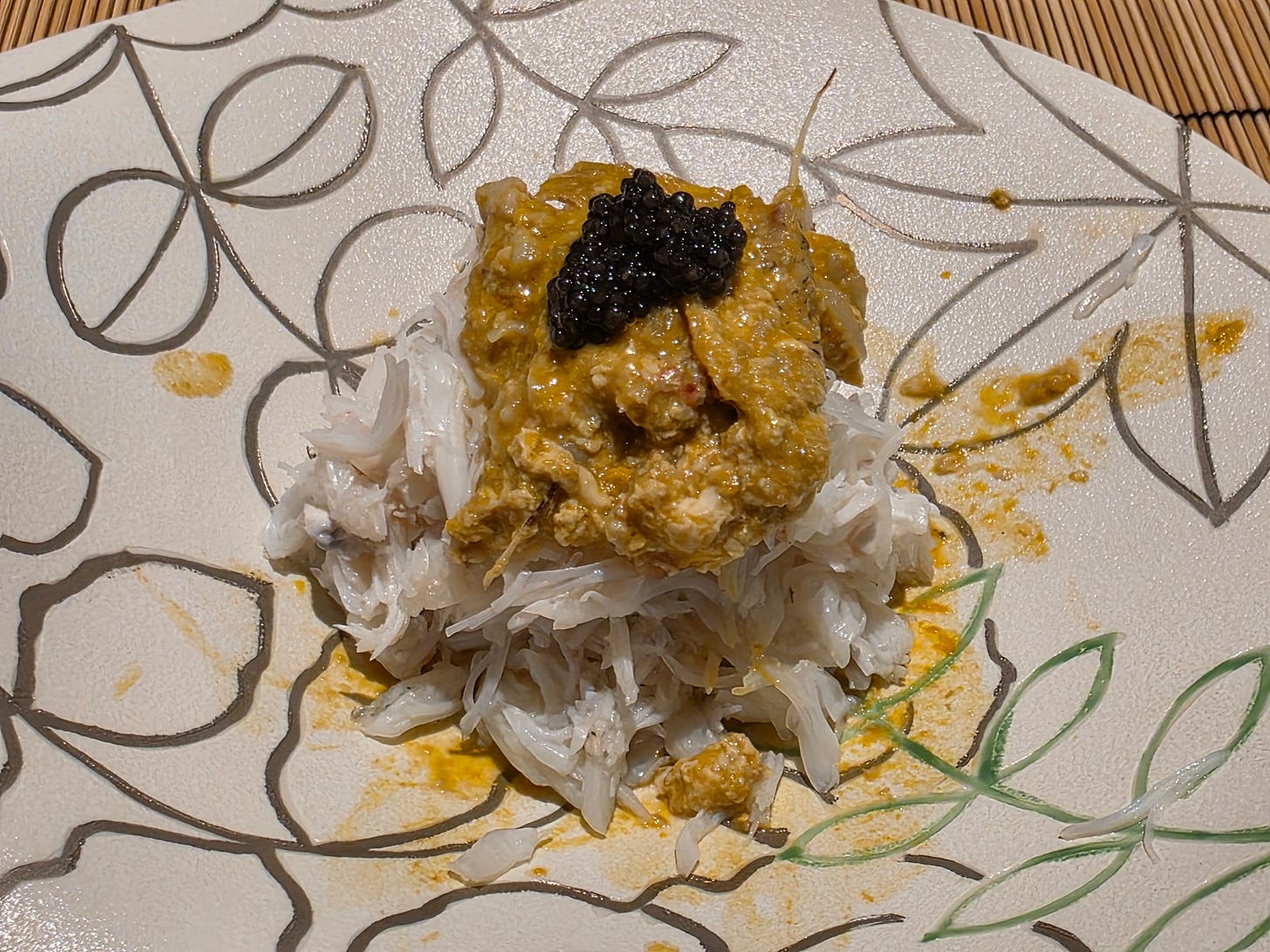 Finally, the unpictured dessert was a half a well-ripened persimmon. Oddly enough, old wives tales in Korea and China believe that eating persimmon and crab together is toxic. The Japanese clearly have no such belief.