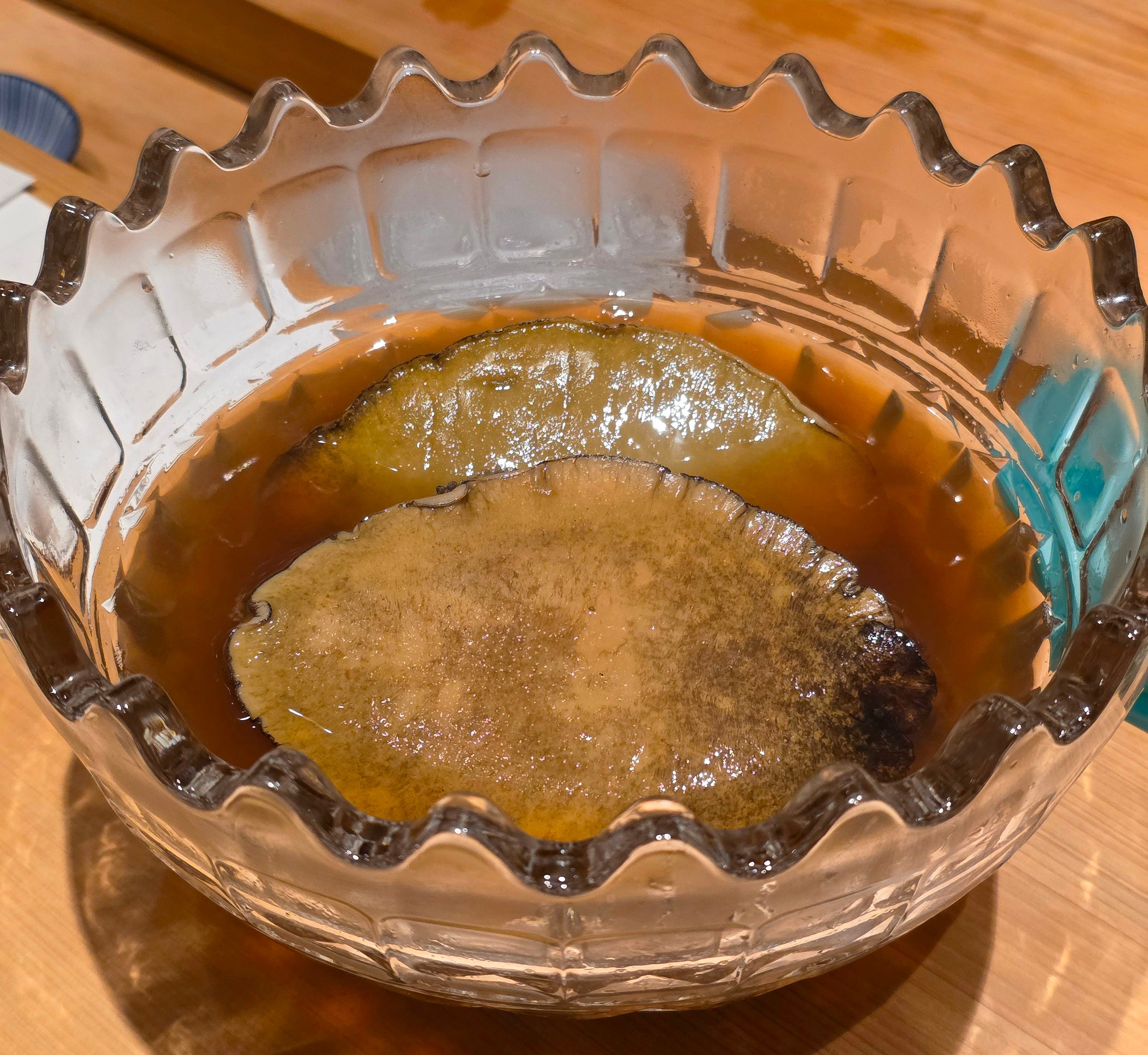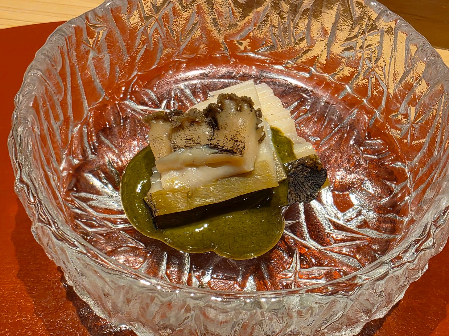 The next dish was a traditional one that I remember fondly from Sushi Shikon. A lightly poached abalone served with a abalone liver sauce. As the restaurant manager explained, the sauce itself is a combination of the abalone liver, white miso for umami and uni for a bit of richness, and each chef adjusts the proportions slightly into their own signature combination. The abalone was incredibly tender and I would argue that it was done better than Shikon!