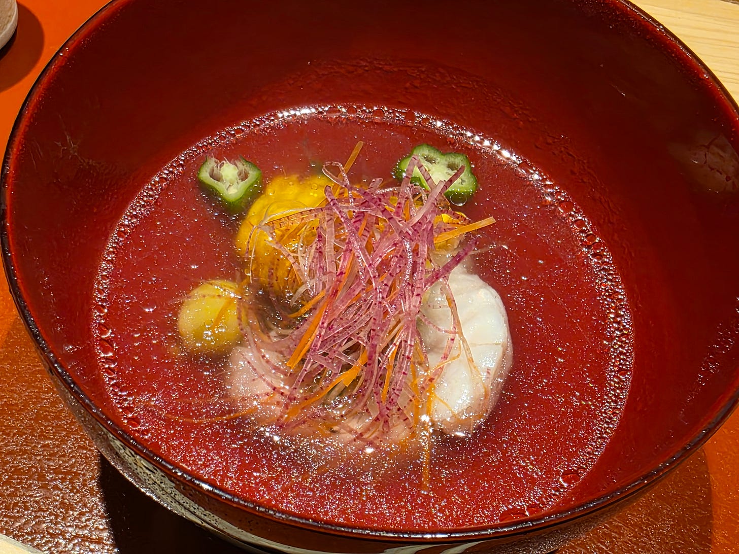 Another Hokkaido specialty, a very light dashi broth with okra, gingko nuts, corn and Kinki fish. Deceptively light and clear, the soup hides a depth of flavour and hit of umami.