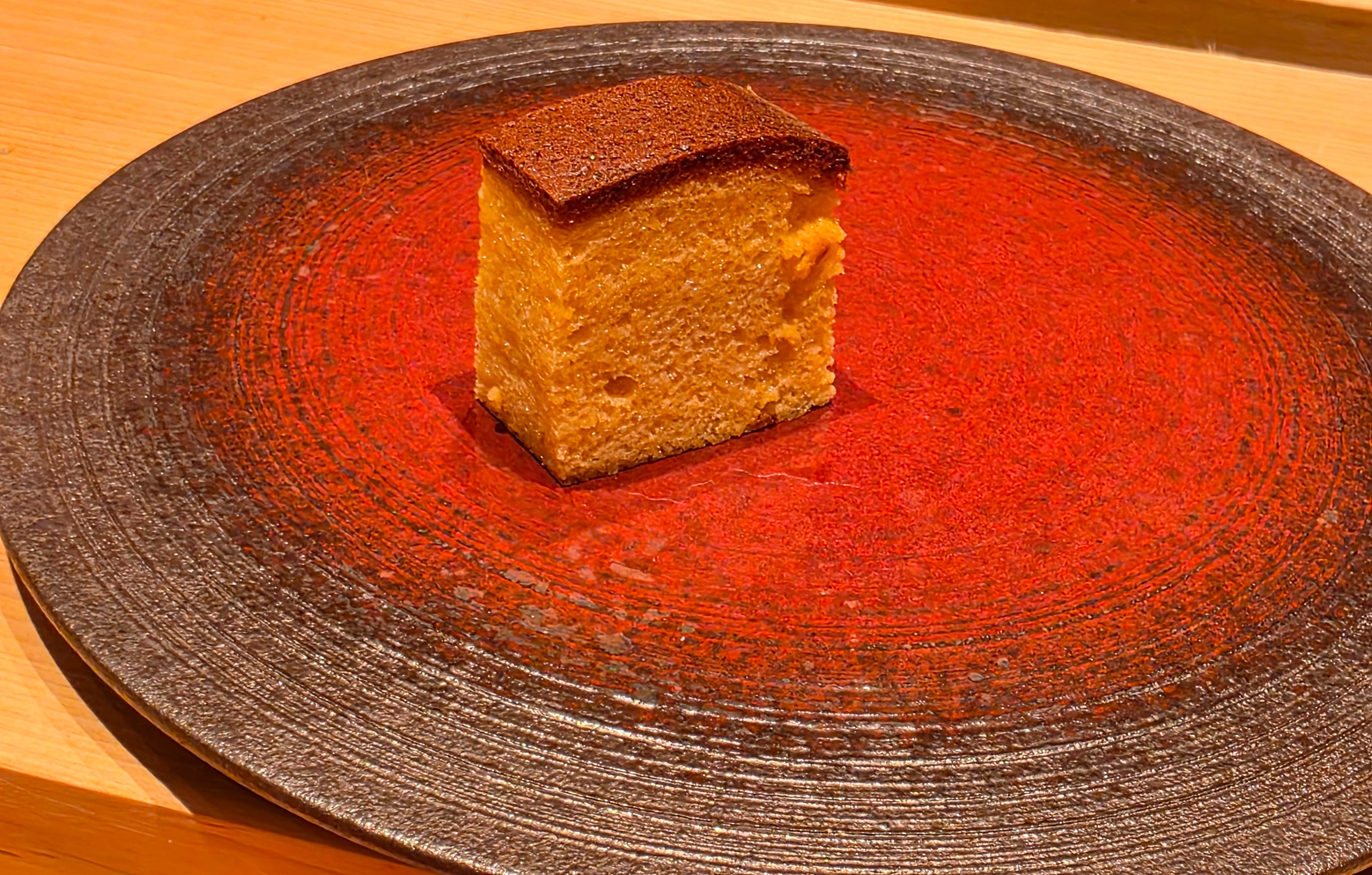 The traditional light fluffy egg castella, a type of sponge cake adapted from Portuguese settlers, but almost always presented at the end of a omakase meal.