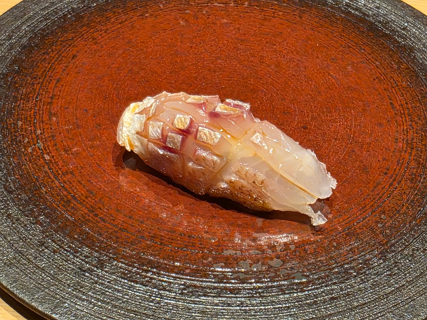 Moving into the main event, the nigiri dishes, we started with lighter white fish - a baby seabream, lightly scored to enhance the texture.