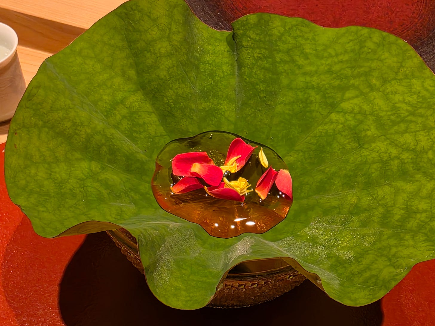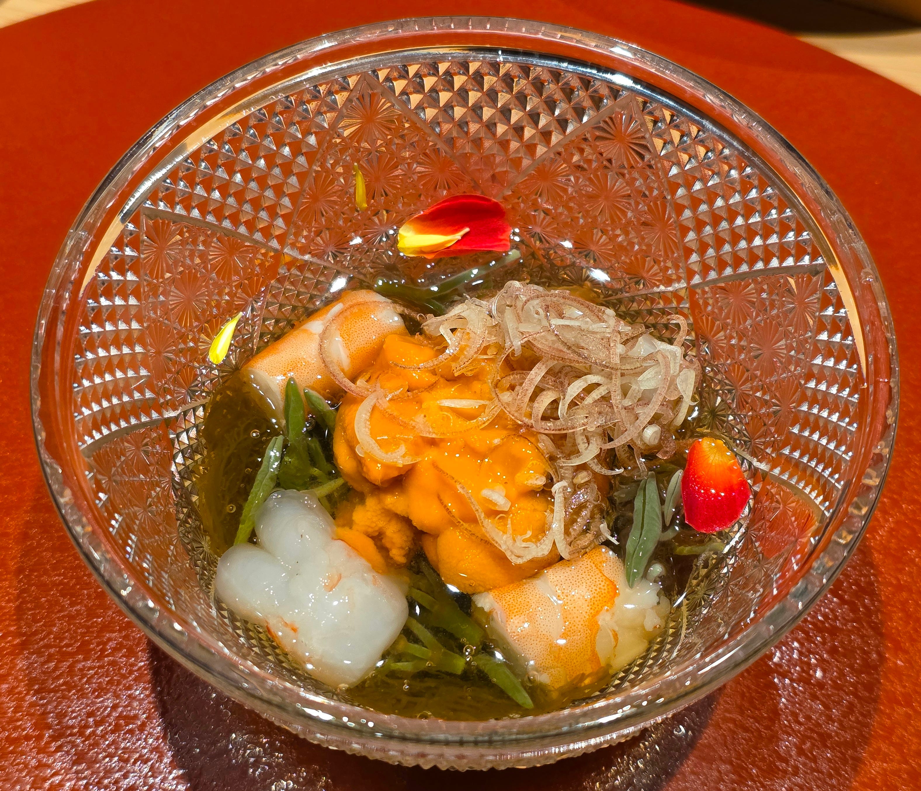 The appetizer was an interactive experience, with a sweet and tangy vinegar bubble presented on top of a lotus leaf. We were told to use one hand to slowly pull the lotus leaf and let the bubble of sauce drop into the appetizer below, containing pieces of tiger prawn, bafun uni, lotus leaf shoots (jyunsai) and rock seaweed. Hits of sweetness from the lightly poached shrimp, a hit of tangy from the vinegar sauce and richness from the uni. Delicious.