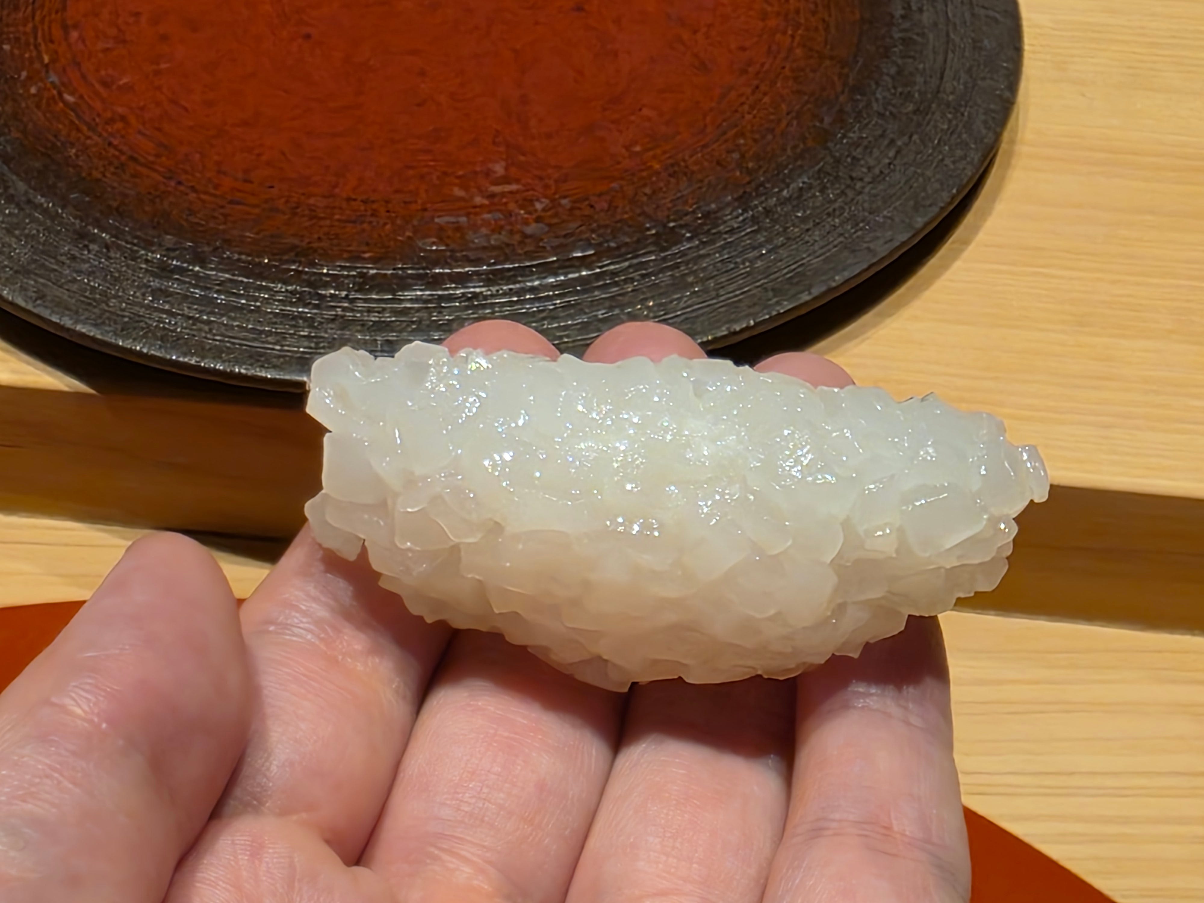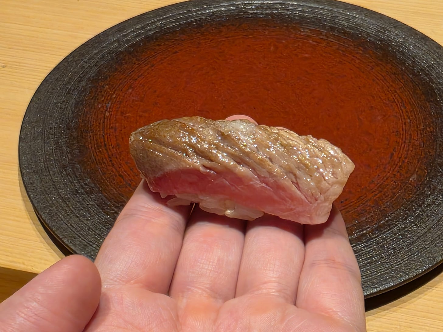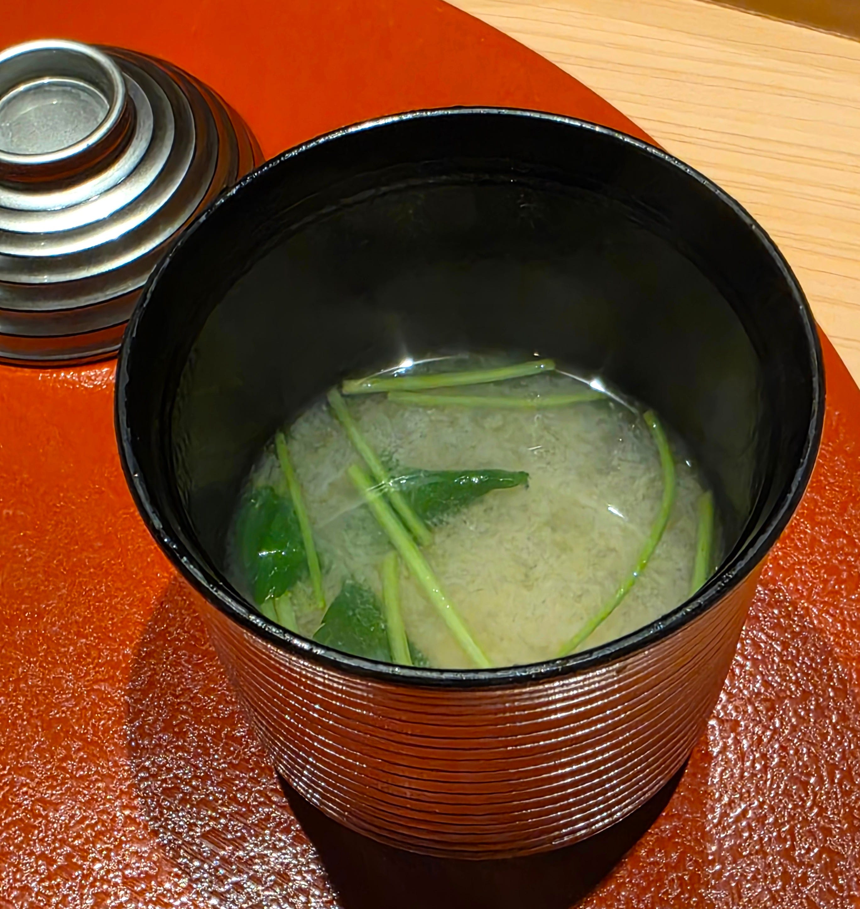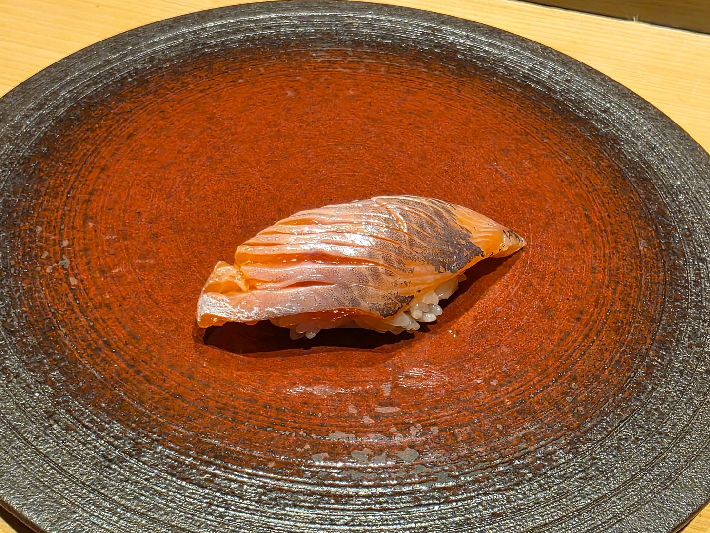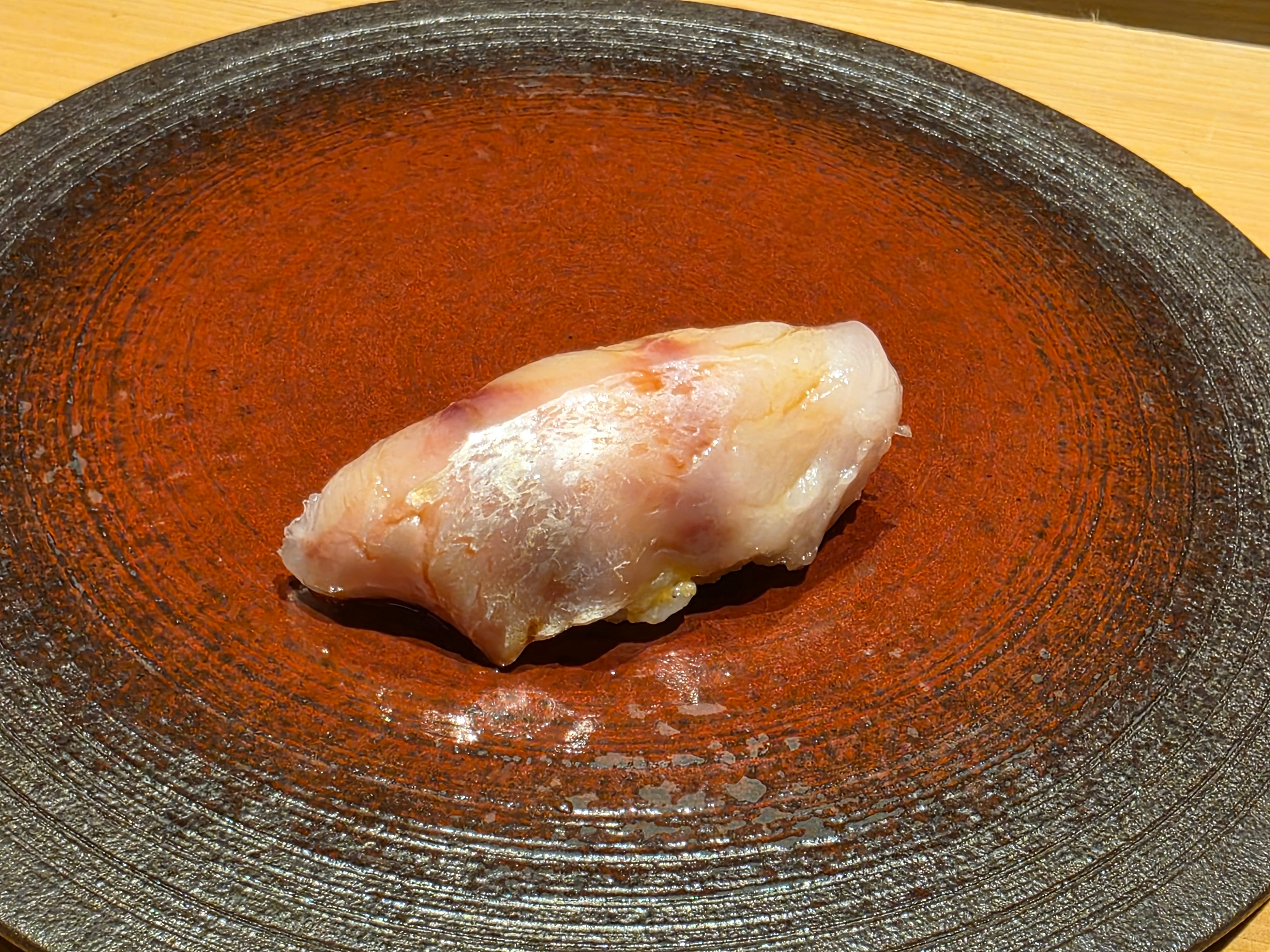 An unique nigiri I have never tried before, a mince of Swordtip squid, lightly salt-cured and pressed into a Shizo leaf and topped with yuzu juice. I usually avoid squid nigiri as the chewiness makes it difficult to eat. The chef mitigated the usual chewiness by chopping the squid into a rough mince and insisting that he serve it straight into our hands, so the loose mince doesn’t break up. It’s the first time I’ve ever seen this preparation and an absolute highlight of the meal.
